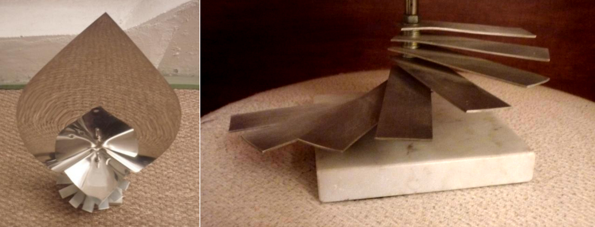 To conclude this section, we have added an example of much thinner plates, metal strips so thin that they can be bended with one's bare hands. Offering yet another connection to plucked thumb pianos, François Baschet designed a series of small-sized pieces for more humble collectors, using steel strips bolted on an axis and connected to steel reverberating speakers, which can work in the same manner with all the elements we have described above.