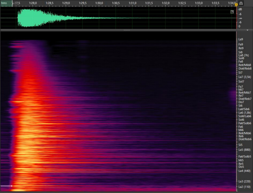 Figure 70. Audio recording and spectrogram of the clamped plates on Fixed Plates DIY kit. (Ruiz 2015).