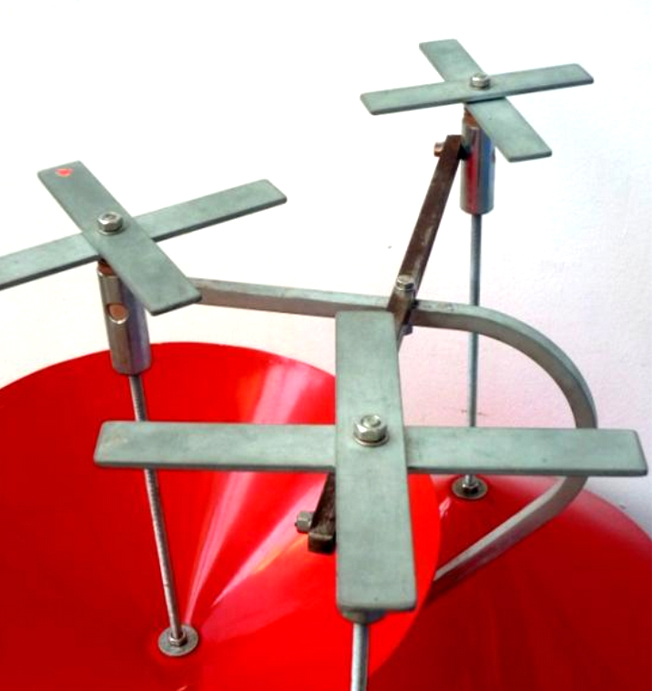 Oscillators: five pairs of iron plates clamped on five threaded rods, forming five crosses, isolated with rubber pipes from the stand.