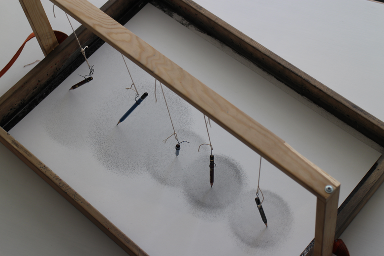 Tehtyäni muutaman kahdeksan tunnin piirustusmeditaation, halusin kyniin lisää painoa. Niinpä solmin kynien painoksi pultteja ja muttereita. 22.11.2019–20.12.2019 välisenä aikana kävelin kilkutuksen säestämänä kahdeksan tuntia.