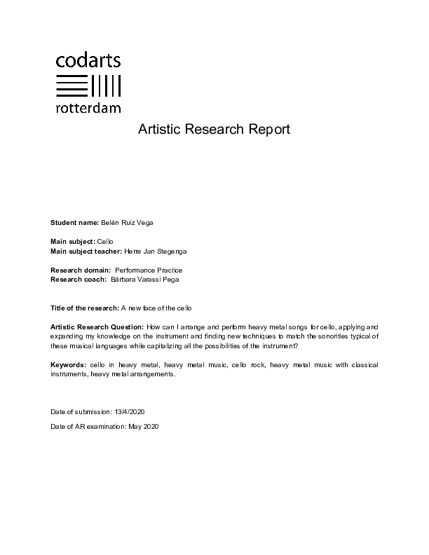 As a cellist, I always enjoyed the classical repertoire but since I started to play this instrument I have tried to reproduce my favourite songs in the cello. Once I developed my cello skills, I started to write transcriptions of the songs played by my favourite bands such as Metallica or Scorpions. Years later, I had the opportunity to spend time researching this topic. So I decided to base my master research on arranging and performing heavy metal songs for cello ensemble. In order to develop my research, I contacted experts related to this topic either for being in contact with heavy metal and rock or for being a cellist outside of the classical world. I listened to hundreds of songs and versions of those songs to take ideas and inspire myself for the arrangements and performances. Finally, I did experiments in order to get different sounds or techniques from other instruments such as slap from the bass or death growls from the singers. As a result of my research, I did three arrangements from different styles within the heavy metal, heavy metal itself, thrash metal and melodic death metal. Throughout this research, I developed my arrangement and performing skills, starting from a basic arrangement from cellos and drums to three cellos; and ending with an arrangement from a standard heavy metal band with new techniques included, to four cellos. During this journey, I could improve step by step my skills and show all the progress in the last part of my research combining all the knowledge acquired through the process. As this topic was unexplored, my research could be a base for musicians interested in arranging and performing heavy metal. With it, I wanted to bring closer the cello to all the people. Nowadays, classical music is losing audience and this new point of view can be a tool to have an impact on a new public. Since the last century, the cello has been included in a lot of popular songs, from The Beatles to Pink Floyd. Bands increased the use of the cello to the moment that ensembles of cellos, such as Apocalyptica or Break of Reality, decided to do something new and bring this instrument to different styles of music and showing the versatility of the cello.
