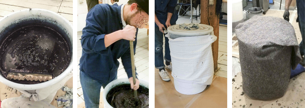During the workshop, we called the vat many different names, rarely anything that could be defined as distancing; some attendees called it ‘she’, some ‘baby’, or ‘our baby’. Indeed, maintaining the vat - caring for it and protecting it, felt much like having a small child in the workshop. Recent literature related to living media has noted the same idea, e.g. referring to it as a pet (Camere & Karana, 2018:576) but in indigo practices, this has long been very common. Balfour-Paul (2016) confirms this through several examples of how the use of humanising language related to the indigo processes is widespread amongst artisans: sukumo fermentation takes place in “the bedroom” (fermentation chamber), where the pile of leaves is covered with “bedcovers” (a straw mat). If problems occur during the fermentation phase, it is said that “the baby has caught a cold” (ibid.:107). The tone used to describe the vat in the sukumo workshop was also very intimate, not always using specifically humanising terms but nevertheless highlighting the aliveness of the vat. As an example, after the dyeing begins, it is not only the dyer who works; the vat is also considered to be working. Whenever the vat ‘needs to work hard,’ it gets ‘tired’ and ‘needs to rest the next day’.