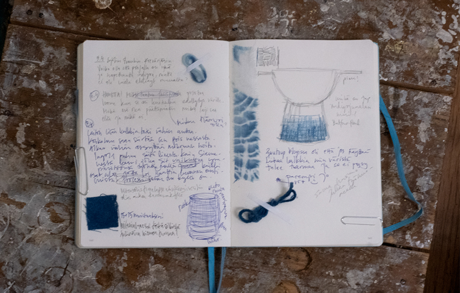 This exposition presents a traditional process of indigo vat[1] dyeing. A fermented indigo vat is an ancient method of dyeing textiles. The process is based on bacterial action (Balfour-Paul, 2016:119-123), which means that the vat is alive: it is a living design medium. The term living design medium[2] is relatively uncommon and is currently used in a broad area of different contexts, without a fixed meaning[3]. Here, a living design medium, or living design media in the plural, refers to all material production or means of modification that incorporate simple living organisms such as bacteria. A living design medium also includes and implies a designer[4] perspective. Thus, it does not refer directly to, for example, ready bio-based materials, although they can be, and often are, the outcome when working within a living design medium. The journey of this research starts with a specific indigo dyeing workshop (described in more detail later) and experiences of keeping a fermented indigo vat, Frank, for six months at home (also described later).