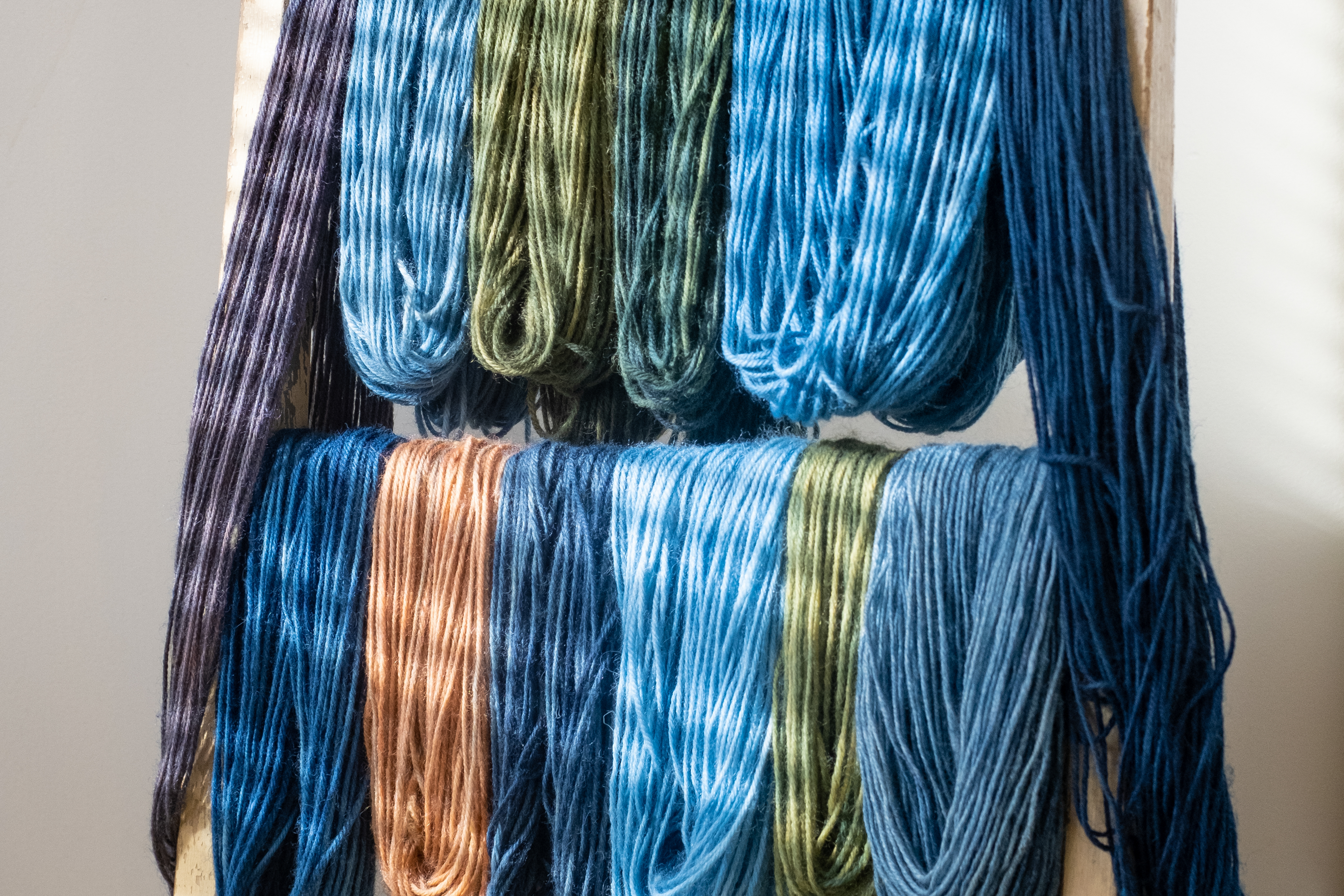 Photo: A palette of natural colours on wool, dyed with indigo (Indigofera tinctoria and Isatis tinctoria), madder (Rubia tinctorum), and weld (Reseda luteola)