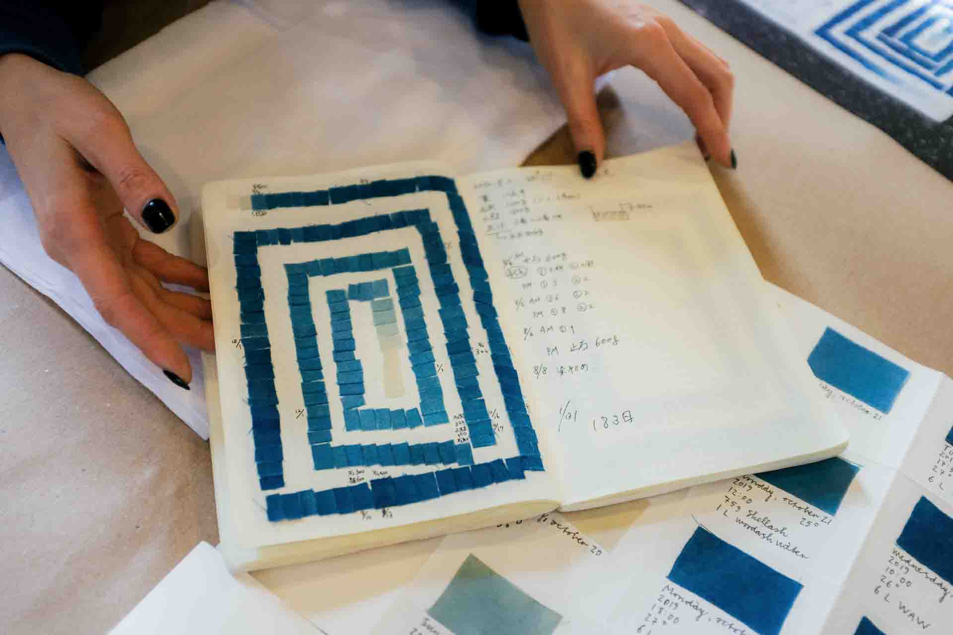 Photo: The condition of the vat is documented daily, as for instance in this 'vat lifecycle' by Kakuo Kaji, Buaisou founder, presented in the sukumo workshop