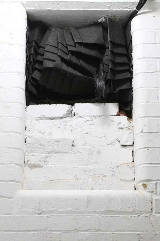 My previous works have engaged directly with particular architectural spaces, drawing out in a non-explicit way the stories residing there. When I make sculpture for a pre-determined space, the scale and form are conceived for that space and the narratives already inherent thereto. Cork Blimey!, inside a former cork factory, physically embodies the history of the building, literally plugging a gap in an interior wall and taking on the purpose of the objects historically manufactured there. But even this function remains ambiguous: does the work fulfil a function at all? Is the work plugging a gap or preventing something from escaping? Or is the work itself the escapee? Is it emerging from a gap or retreating into it? The scale of the piece is likewise ambiguous, and we have no way of knowing how far the cavity behind the wall extends. As far as the eye can perceive, the sculpture could even be supporting the building, rather than the other way around.