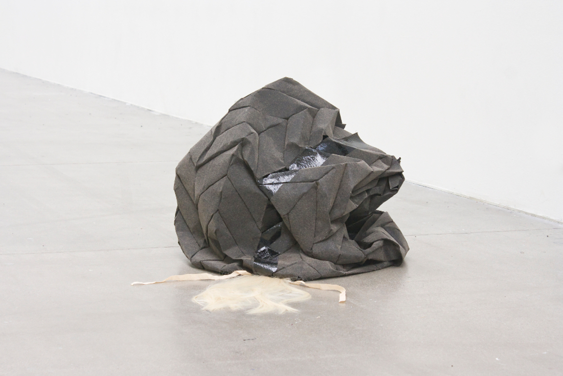 The nature of performativity and singular storytelling is brought into question in the relationship between spoken texts and sculpture. The self-contained narrative of the sculptures is undermined and built upon by the voicing of texts which transform them into a kind of stage set, wherein they are both the environment and characters in the narrative. This is activated in a more phenomenological sense by the viewers’ movement amongst them and through the space surrounding them, even when a text is not read. The experience is shaped in some cases by the sense of there being a front and a back, but in others by a full yet hollow volume to walk around. The use of materials such as feathers, fringing and artificial hair in combination with metal or roofing felt enhances this sense of drama, embellishing both objects and stories.