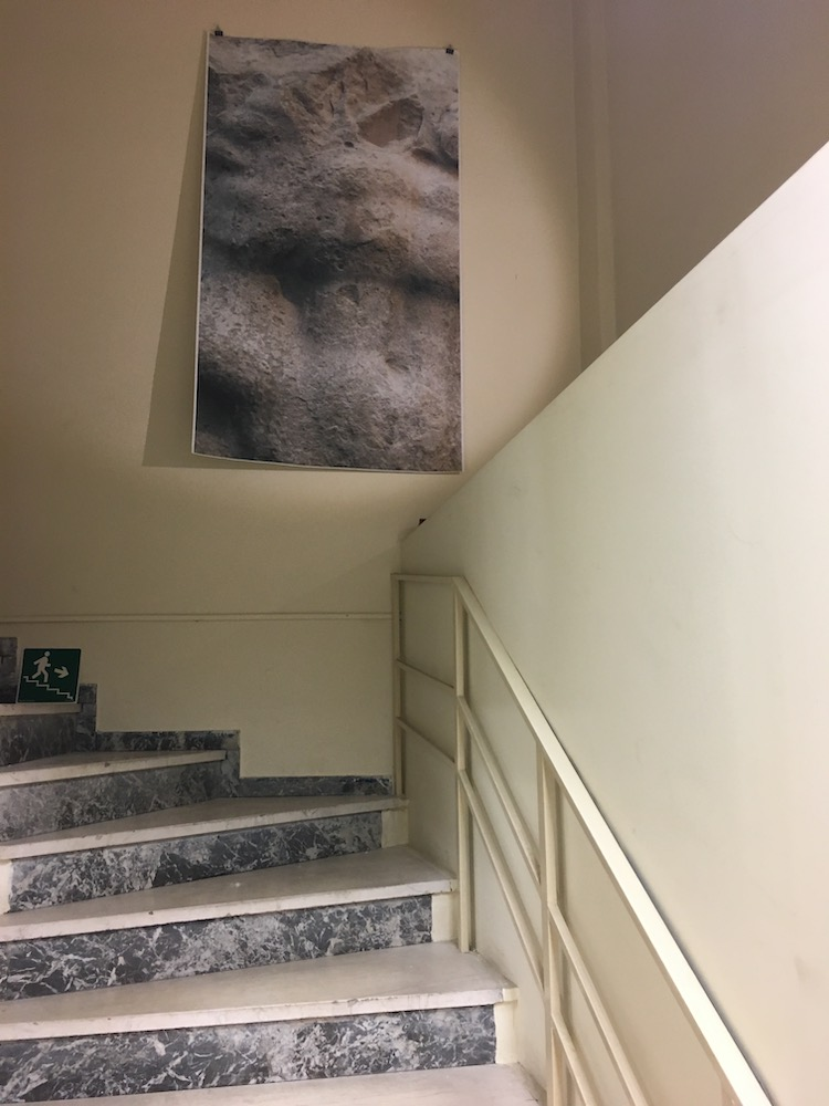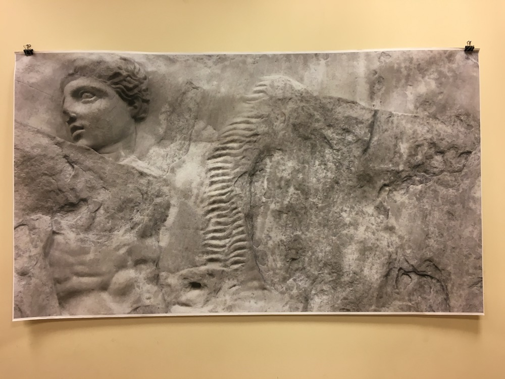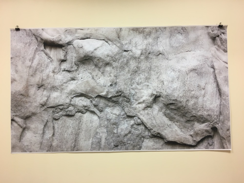 The other print was positioned above a marble staircase, which alluded to the current site of the original sculpture, up a set of stairs at the end of the Parthenon gallery in the British Museum, as well as its original position up near the pediment on the Parthenon. This was also a deliberate rhetorical positioning, not intended to command respect for the sculpture or my reproduction of it, but to highlight the aesthetics of the material itself, and its history of construction, weathering, displacement, its silent gaze back to millions of museum visitors, and its journey back to Athens in another form.