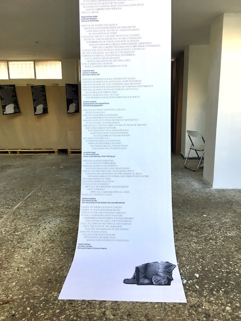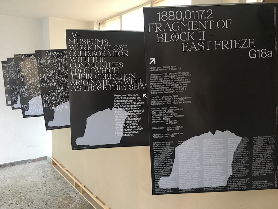 Arévalo, in addition to her 4m-long printed poem, also produced an essay spread across seven posters, using the ICOM (International Committee of Museums) Code of Ethics as its premise: she thereby addressed the sculptures’ displacement more directly.
