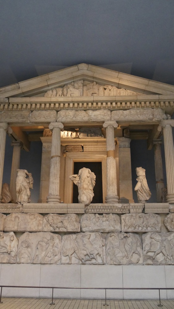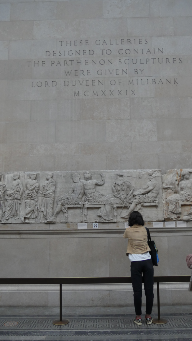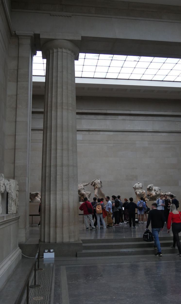 Inside the British Museum, the Parthenon galleries mimic the real thing, but inverting interior and exterior in relation to the Parthenon: in the literal reconstruction of the temple façade in part of the gallery, in the columns placed in the corners of the gallery, and more generally in the display of the friezes. Even though the friezes run around the interior walls of the gallery and not the outside of an internal structure (as at the New Acropolis Museum), they are given much more space than their original context and the overall design of the gallery reflects what Christopher Marshall (2012: 34) calls the museum as temple — it was seen by its architect to be a more appropriate setting for the display of treasures than a mere container for sculptures. What its architect called the ‘unsightly litter' of didactic material is banished to a separate gallery, where the visitor’s response to the friezes is staged before reaching them (ibid.: 36).