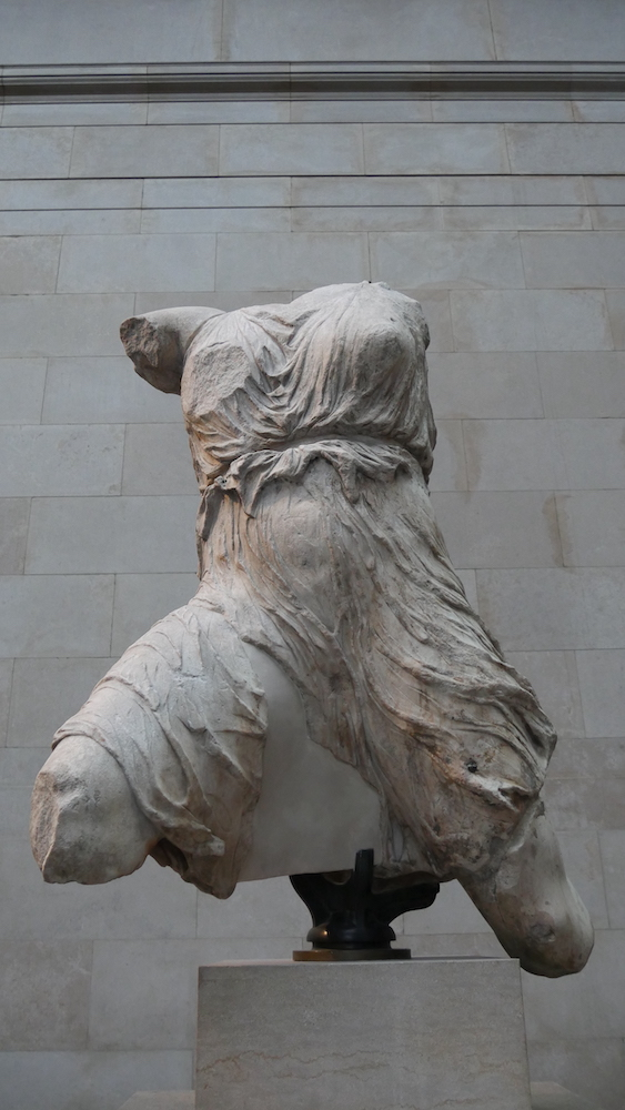 At either end of the Parthenon gallery, pediment sculptures and metopes (high-relief sculptures originally just below the pediments) are displayed atop a small flight of steps. This not only adds to the general aura of respect (the act of climbing steps mirrors the act of climbing up the Acropolis and the Parthenon’s own steps), but it also puts them slightly closer to their original viewing angle. According to Campagna (2021: 39):