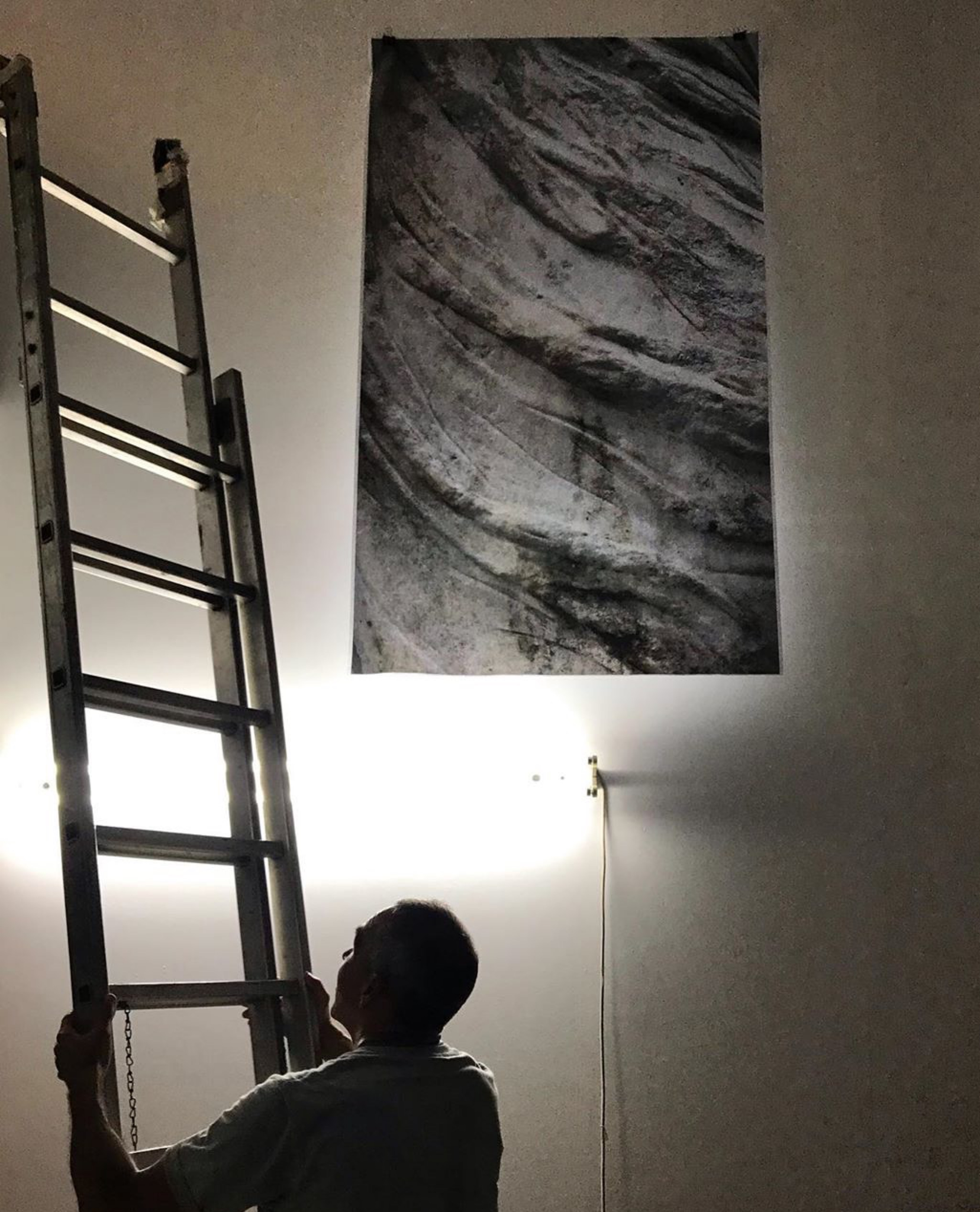 Two other prints were exhibited up high: one in the double-height main room (where cars were once serviced), and the other up a flight of stairs leading to the second floor and additional works by other residents. The print in the main room was from a statue of Athena’s messenger Iris, carved to suggest she was in motion. The framing of my photo, the material it was printed on, and the fact that it was hung only from the top, meant that when the large doors were opened, the sea breeze gave it a new kind of life and motion — animation without technology. In addition, the composition and placement perfectly complemented Arévalo’s large hanging poem.