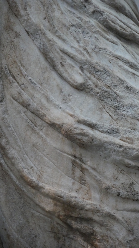 Besides the lightbox drawing I created, detailed in the Archaeology section, I selected close-up photos of details of Parthenon sculptures in the British Museum, and printed them on large (2 × 1m) sheets of fabric. I saw this as a way of bringing the sculptures back to Athens, but in a different form, scale and context: bringing the micro to the meso scale to address macro-level issues. I chose to exhibit two of them near the entrance, in what was formerly an office, alongside a display of books that inspired our collective work and discussions. I wanted viewers to be immediately confronted with the materiality of the marble, which contrasted with the rationality of the printed word; and I chose details that contained hints of human form and narrative content, to draw people in to the exhibition theme of ‘Contemporary Archaeologies’.