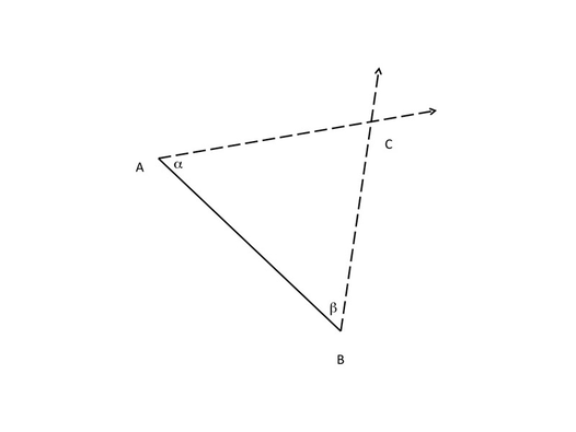 Triangulation is a basic geometric procedure that allows a third point (C) to be constructed from any given two points (A and B), provided that the two angles to it (α and β) are known. (fig. 3)