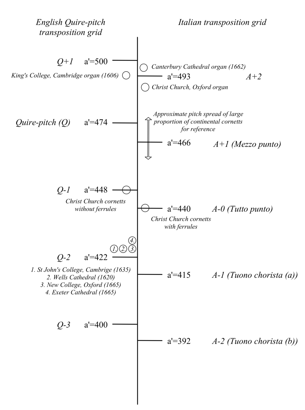A straightforward performance of the extrapolated lines of the organ score of Loosemore’s Verse presents problems of range and tessitura in the instruments that have prevented this piece receiving any attention from players of historical instruments until now. The main hurdle is that the ostensible ‘cornett part’ (Loosemore’s second line down according to the title of his piece) is consistently, and occasionally unplayably low. I began unpicking this issue during practice-led research using my second artefact, modern reconstructions of the Christ Church cornetts, historical examples of the type of instrument on which this piece may have originally been played.1 The Christ Church instruments are two of only three surviving cornetts whose English provenance can be stated with any degree of certainty, having been purchased, according to the plaque on the case in which they are kept, for the visit of James I to Christ Church Cathedral on 27th August 1605. Both instruments have ornate silver ferrules bearing the college crest at the mouthpiece end (see the image on page 1). These serve a decorative function, and also lower the pitch of the instruments, possibly in response to a discrepancy between the organ and cornett pitches when they were first made. According to Jamie Savan, the Christ Church instruments are pitched at a'=448–452 without their silver ferrules, the addition of which bring them down in pitch to around a'=440.2 In Figure 1, I have drawn on the work of Bruce Haynes to visualise how both incarnations of these instruments (with and without their ferrules) interact with a selection of known organ pitches from seventeenth-century England.3 This shows how, as Haynes and Savan suggest,4 upwards transposition by a tone in the cornetts would have been one way of reconciling the cornett and organ pitches where organs are pitched especially high (for example, the King’s College, Cambridge, Christ Church, Oxford and Canterbury Cathedral organs clustered around Q+1 on the diagram).