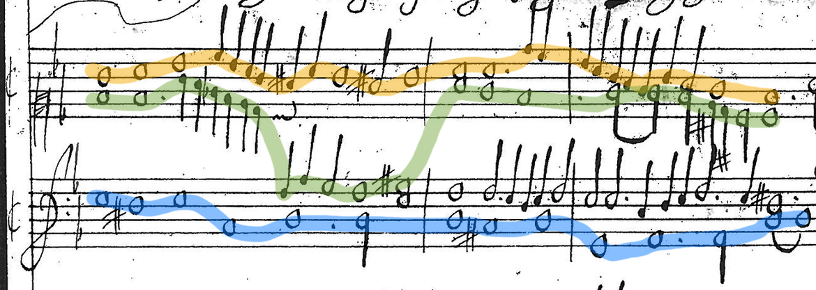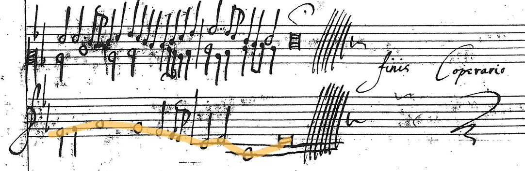 Once I had established the parameters of this approach in Loosemore’s piece, I turned to the Coprario Verse, an altogether more challenging prospect musically, given the static harmonies, long phrases, and bold use of dissonance that characterise Coprario’s writing in this instance. The instrumentation as listed in the title suggests that the cornett might take the top line of the organ part and the sackbut the bottom, but with an upwards transposition of a fourth, this would make an anachronistically high part for the cornett (whilst still neatly fitting the range of the St Teilo organ, as orange highlights in Figure 5 show).