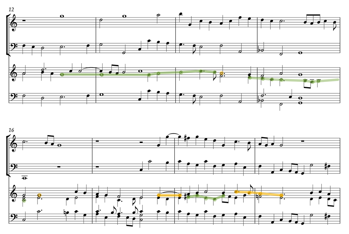 An alternative solution is therefore required. Examination of Coprario’s writing for strings in a similar idiom to his Verse shows that the melody instrument part is often an amalgam of all three top voices in a predominantly four-voice texture, with material being taken mainly from the middle two voices, either at pitch or in octaves, to render the instrumental part (see Figure 6. Orange highlights show where the melody instrument part appears in the top voice of the organ, and green highlights show where the melody instrument part appears in the inner voices).