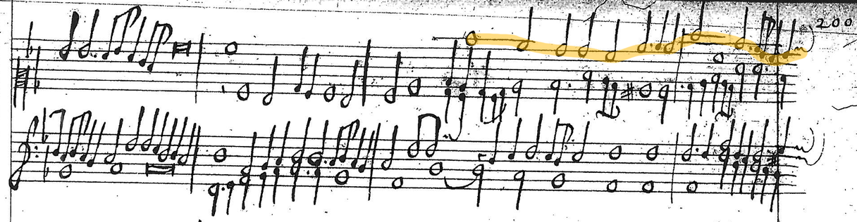 Figure 5: John Coprario, A Verse for the Organ, a Sagbot & Cornute, bb. 16–19 and bb. 36–37, MS Drexel 5469, p. 200–1. Highest and lowest passages for organ highlighted in orange.