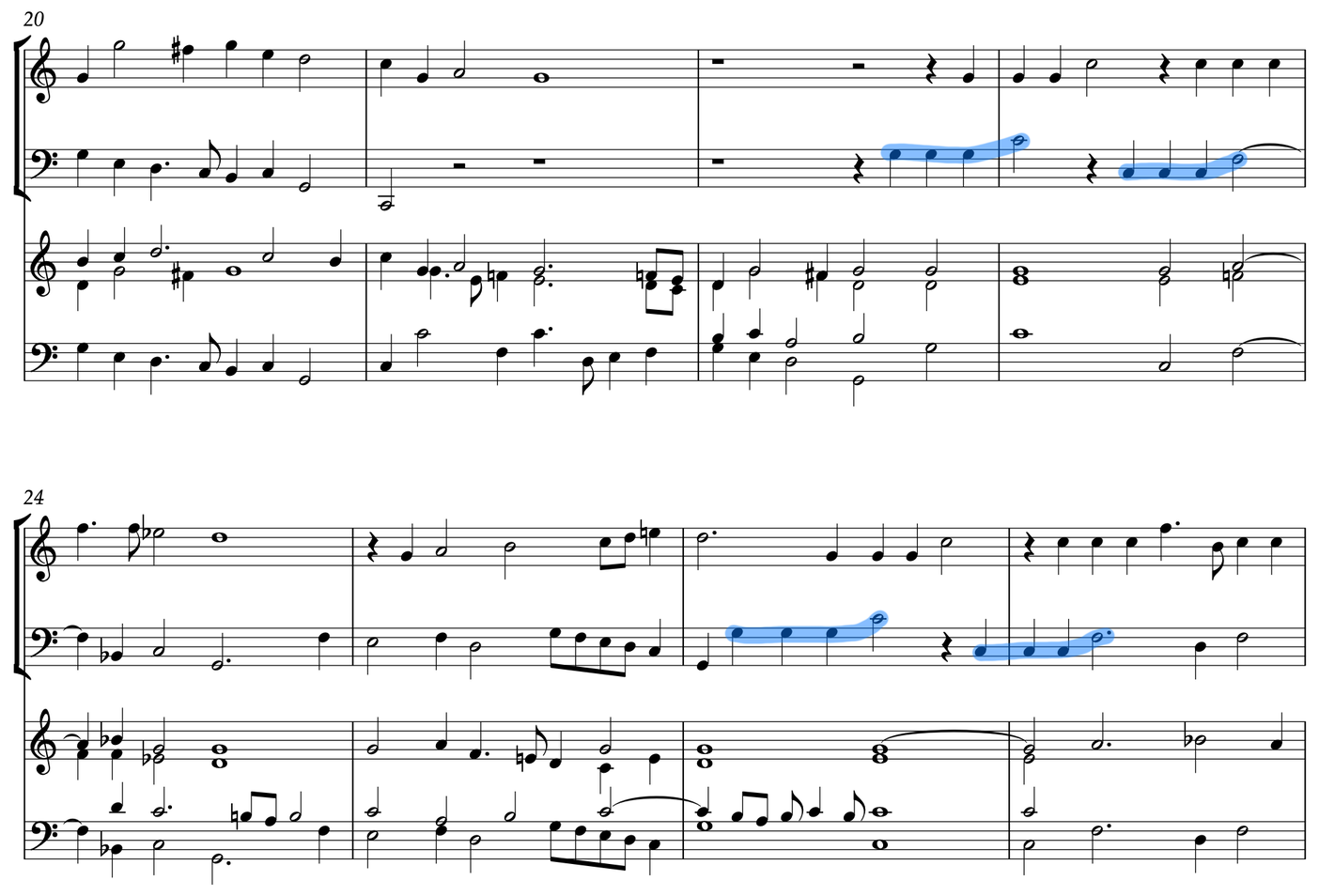 This approach is corroborated by the cornett writing in Hingeston’s Fantasia: for one Cornet, Sagbott and organ, in which the organ and upper instrumental parts cross frequently (see Figure 7, where the melody instrument part is marked as above), and in which organ counter-melody is a clear feature of writing for this ensemble (see purple highlights in Figure 7).3 The bass instrument lines in the fantasia-suites of both Coprario and Hingeston are almost exact transcriptions of the organ bass line, with the addition of occasional rests and rhythmic alteration to maintain a point of imitation, and this is the approach adopted here (see blue highlights in Figure 8).