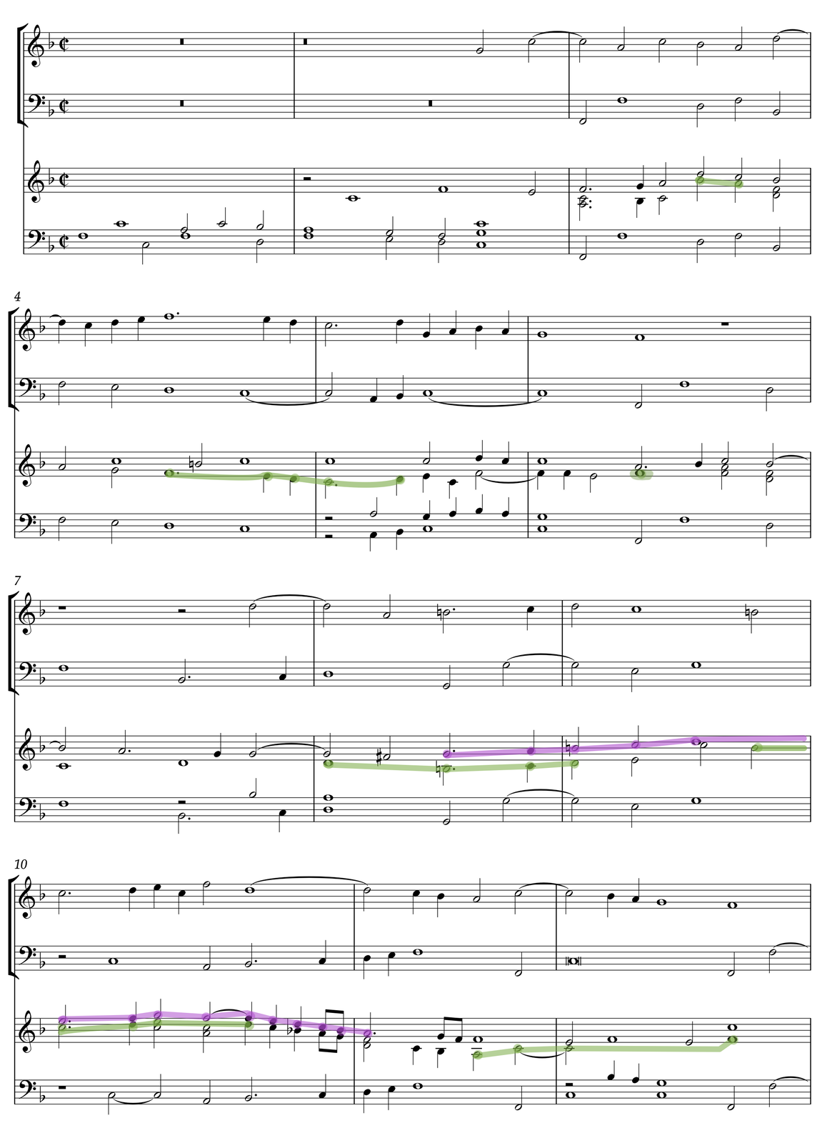 An alternative solution is therefore required. Examination of Coprario’s writing for strings in a similar idiom to his Verse shows that the melody instrument part is often an amalgam of all three top voices in a predominantly four-voice texture, with material being taken mainly from the middle two voices, either at pitch or in octaves, to render the instrumental part (see Figure 6. Orange highlights show where the melody instrument part appears in the top voice of the organ, and green highlights show where the melody instrument part appears in the inner voices).