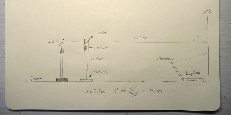 The Optial Seismograph (OS) picks up virbrations from the floor in room (1). A flat dish containing liquid (water or oil) is placed on the floor centrally in the room. The reflection of a laser beam directed at the surface from above is projected via a small mirror on the wall below the window in room (2). The light point on the wall draws a trajectory related to the ondulation of the liquid – a transposition of the floor vibration through the dynamics of the container/liquid system. The light point is picked up by the built-in webcam of a laptop sitting on the floor in front of the wall. The laptop impersonates a cyclops observer, slighly reminiscent of Nam June Paik’s TV-Buddha. Blob tracking is used to (re)construct the trajectory (as a series of [time, x, y] triples) and a low resolution grey scale dynamic pixel map is extracted. The pixel grid is drawn on the wall in pencil. The noise picked up by the OS is the main continious input to the DS, a kind of "ground state" which can lead to spontaneous activations of the other exhibits. The other inputs to the DS are the triggers, the headphone patchbay and the CEUS.