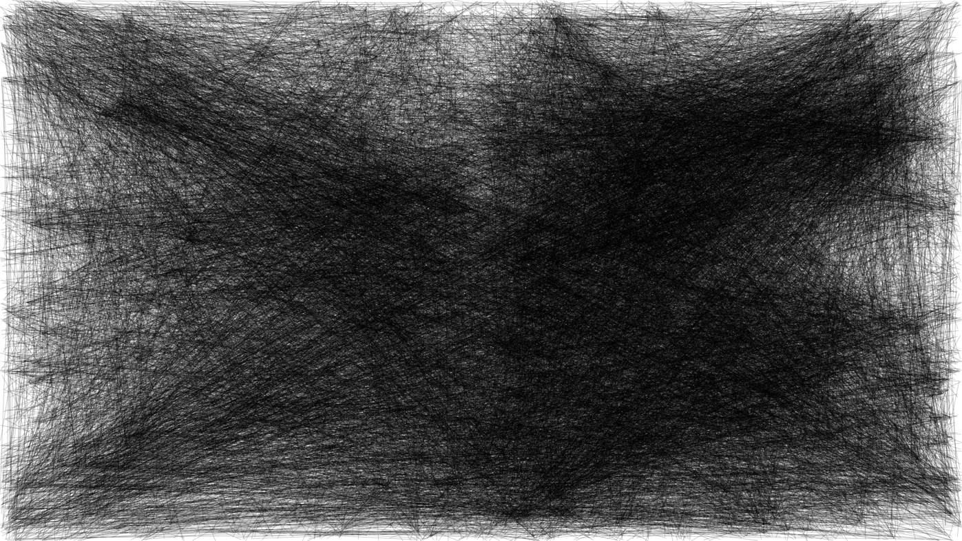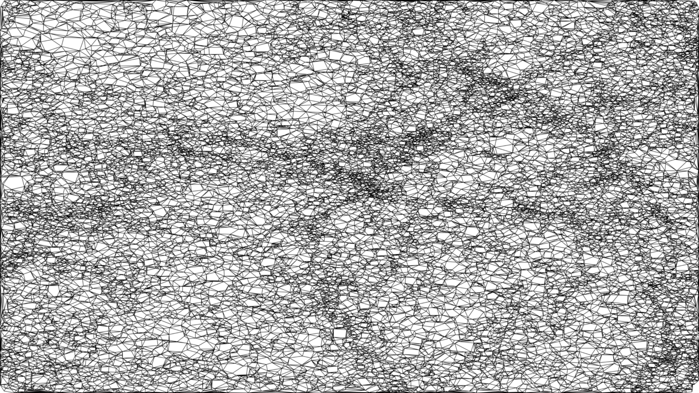 The 3D positions of the galaxy clusters in simulation frame 46 are considered. Each position is joined with a line to the four nearest galaxies in each quadrant and projected on a plane. What kind of structure or figure do galaxy cluster positions subtend? Is there something characteristic about the cluster distribution in the universe? Is there a pattern?