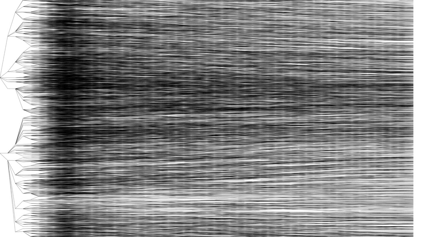 Again a drawing of descendancy relationships between galaxies across the universe's evolution. But now all descendacy paths for all galaxies drawn into the same figure are projected on the x/time plane Is there any kind of evolution structure we could see when following this descendance relations?
