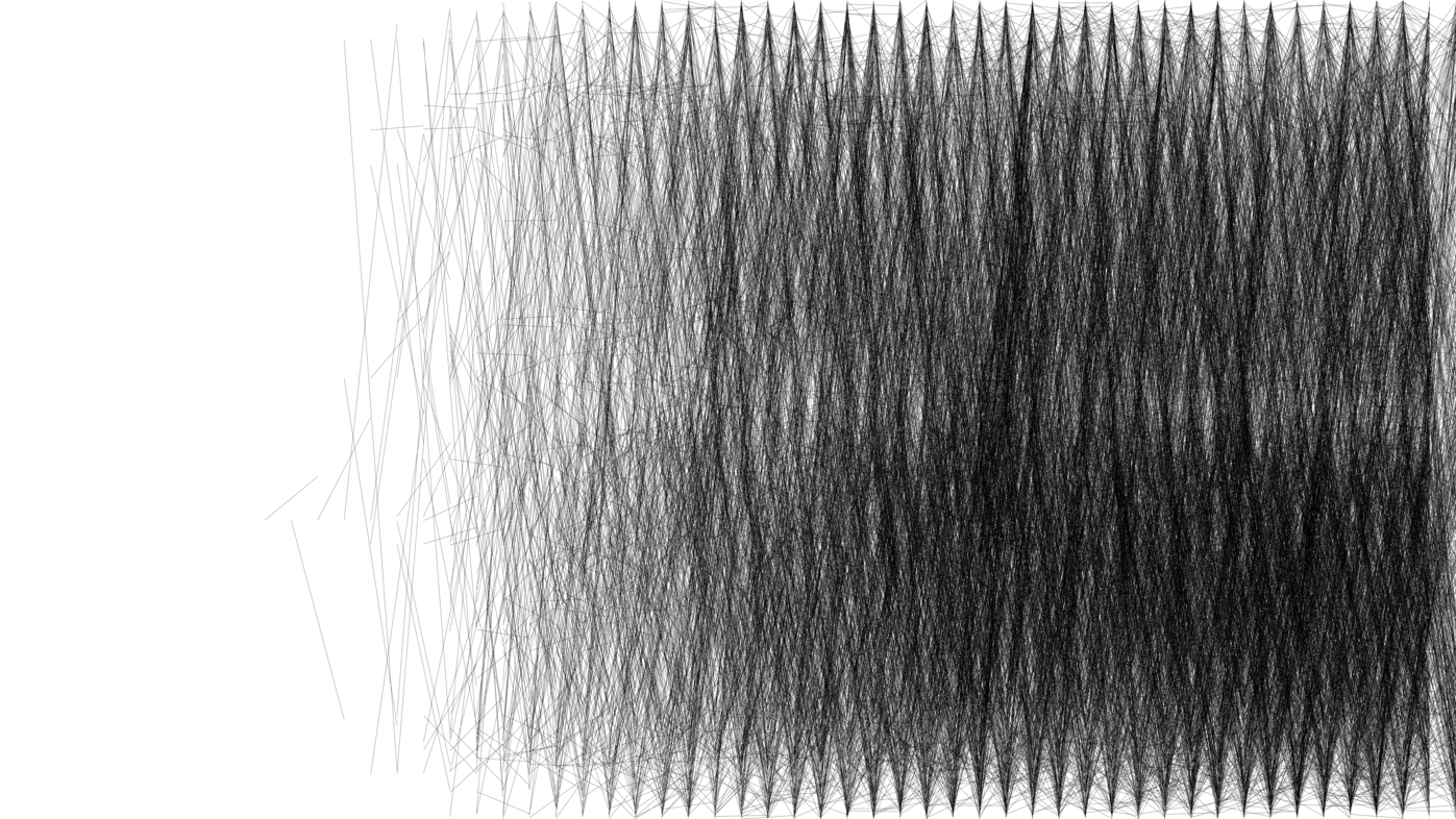 All positions of galaxy clusters along one axis (z) in all simulation time frames are considered. The drawing process draws a line between a cluster position and its nearest neighbour in the next and previous frame. The assumption is that the energy and the mass of a cluster would in some way be injected into the future galaxies which are nearest to it. At the beginning there are few galaxies, but the density increases fast to a maximum which is then maintained almost steadily. How does energy and/or mass distribute across the universe during its evolution?