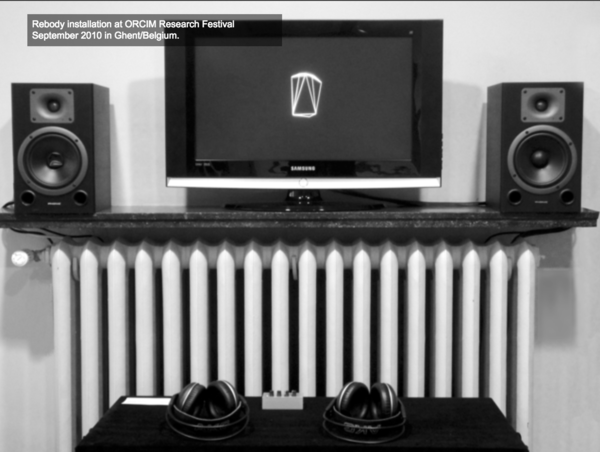 Rebody (2010) by Gerhard Eckel, Michael Schwab and David Pirrò is a video and an installation piece in which the captured motion of a dancer is transformed into a dynamic drawing that informs a musical composition. The piece explores the dance movements, the drawing algorithms and the musical structures in an attempt to create aesthetic resonances and convergences. The work investigates how structured creative processes can transpose rather than represent the dancer's movements. Rebody is based on motion-capture data collected from Bodyscapes (2009), an intermedial dance solo performance by Valentina Moar (choreography/dance), Gerhard Eckel and David Pirrò (composition).