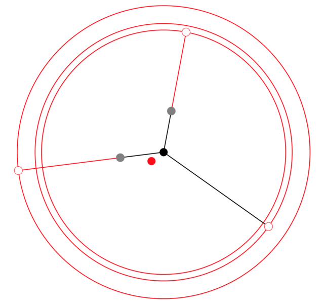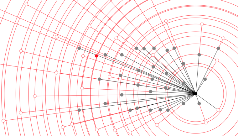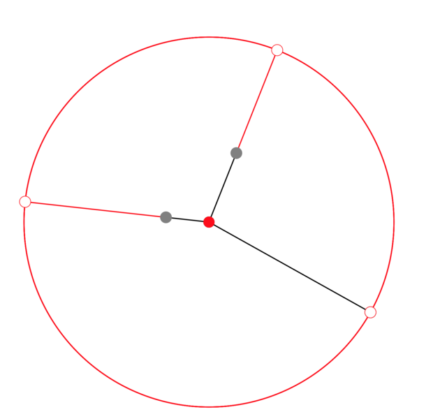 In the installation formulation the different propagation delays of the sounds projected by the loudspeakers are equalised such that the arrival times are aligned for one fixed position (the temporal sweet spot or reference position, which is marked by a light spot in the instalation). This alignment, which is the central compositional operation of the piece, can be performed in the diagrammatic formulation for any listening position interactively. The reference position is marked in the diagram as yet another movable point (red). The alignment is visualised as a projection of the source positions onto a circle centred around the reference position, expressing the condition of equal distances of these virtual sources (small red circles) from the temporal sweet spot. The radius of this circle corresponds to the distance of the speaker farthest away from the temporal sweet spot. The additional delays introduced by the alignment are represented by extending the black lines to the speakers with a red lines to the virtual speakers (cf. figure 4).