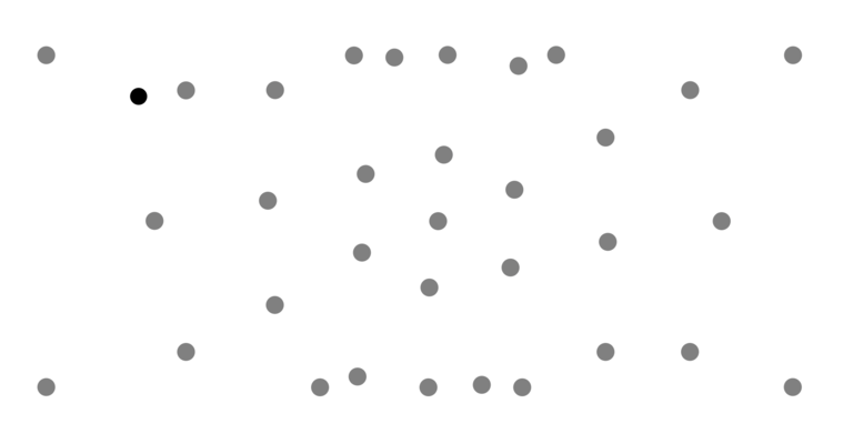 The positions of the listener and the sound sources are represented as points in a plane. The sources and the listener can be moved and sources can be deleted or new ones can be created. All elements of the diagram and all aspects of the sonification change according to the interactive modifications of any of the positions. Changing the listening position (black point) allows to navigate the Zeitraum and changing the source positions (grey points) permits to modify the spatio-temporal composition of the piece. The latter is not possible in the installation, making the complementarity of the two formulations appear.
