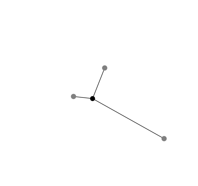 The default configuration of the sources is isomorphic to the loudspeaker constellation in the installation, but reduced to two dimensions and ignoring the orientation of the loudspeakers (i.e. the sources are omnidirectional and arranged in a plane). It corresponds to a top view of the loudspeaker constellation (cf. figure 1). The distances between each sound source and the listener are represented by straight lines from the source to the listener (cf. figure 2) and optionally by circles centred on the listener and passing through the sources (i.e. the radius of the circle represents the distance). This exposes the patterns of ratios between the distances (cf. figures 3, 5, and 6).