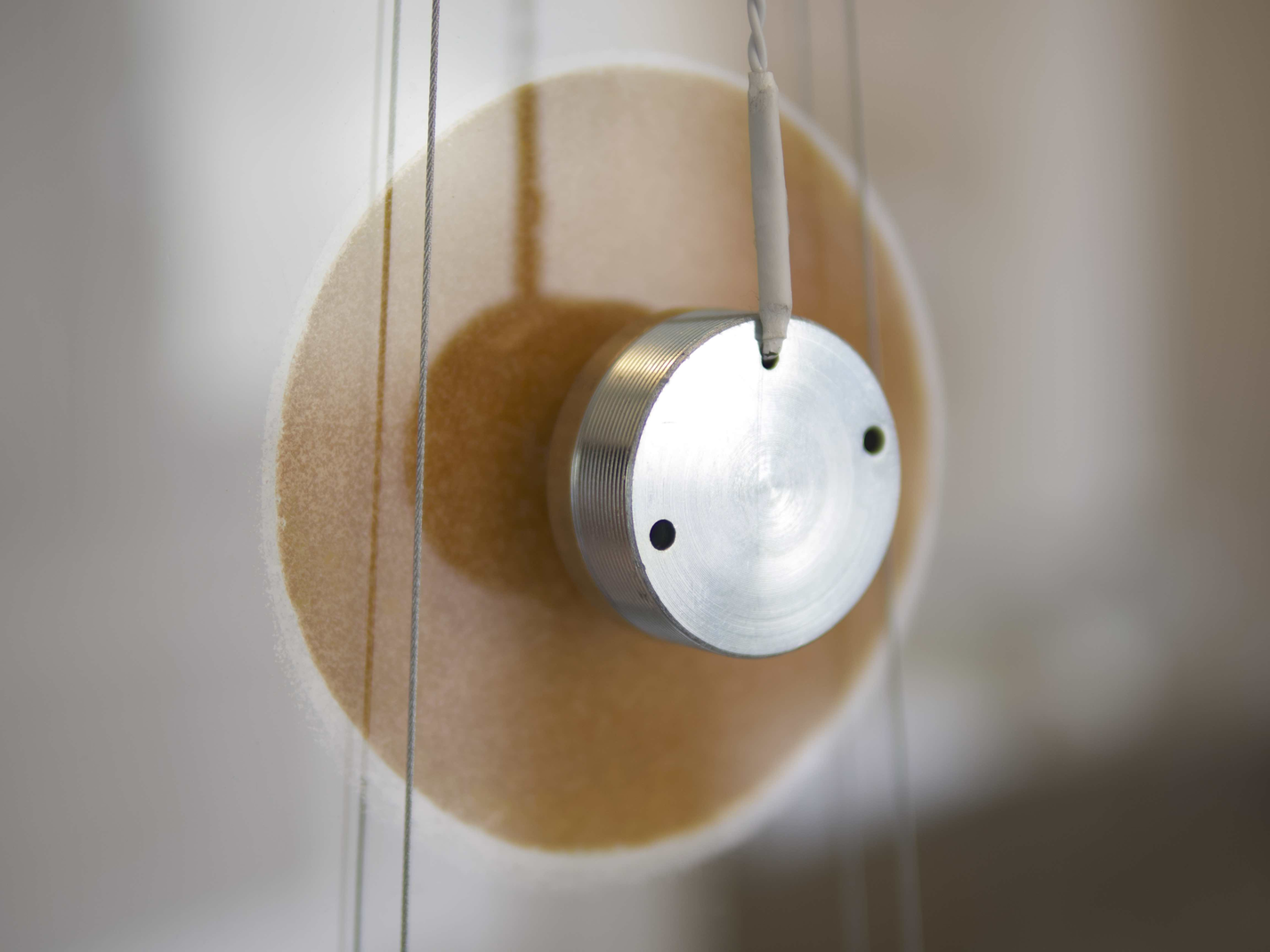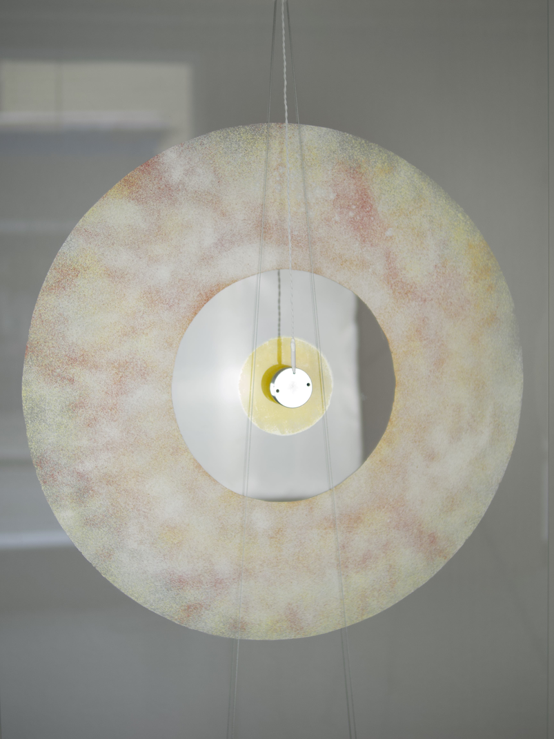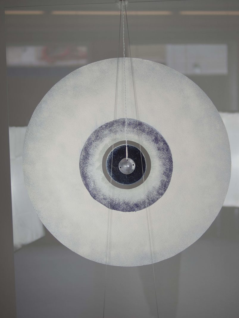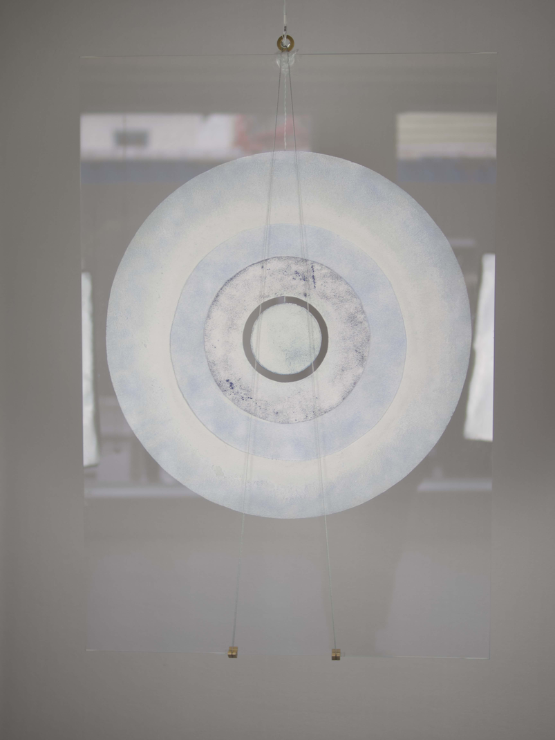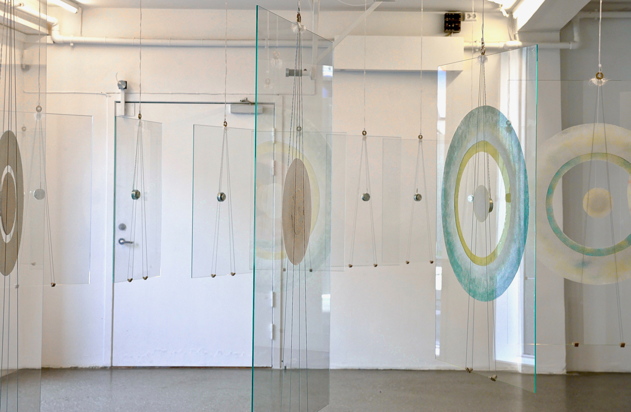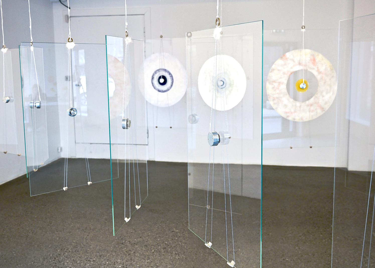 De store glassplatene er preparert med sirkulære ornamenter som kan minne om Hilma af Klimt sine malerier,3 men i tykke lag av tørre fargepigmenter og gips. Ornamentene demper vibrasjonene ulikt, og skaper derfor mikroforskjeller i lyden, men først og fremst har de en effekt på hvordan vi opplever lyden, temperaturen, tyngden, basert på synsinntrykket og tilstedeværelsen av materialiteten. Ornamentene fremhever også overlappingene, eller svevningene mellom platene når de dreier seg og stadig lager nye kalibrasjoner av dybde, tetthet, uklarhet, transparens. De enkle rektangulære formene som glassplatene er, blir sakte men sikkert til et kaleidoskop som utfordrer opplevelsen av fiksert form.