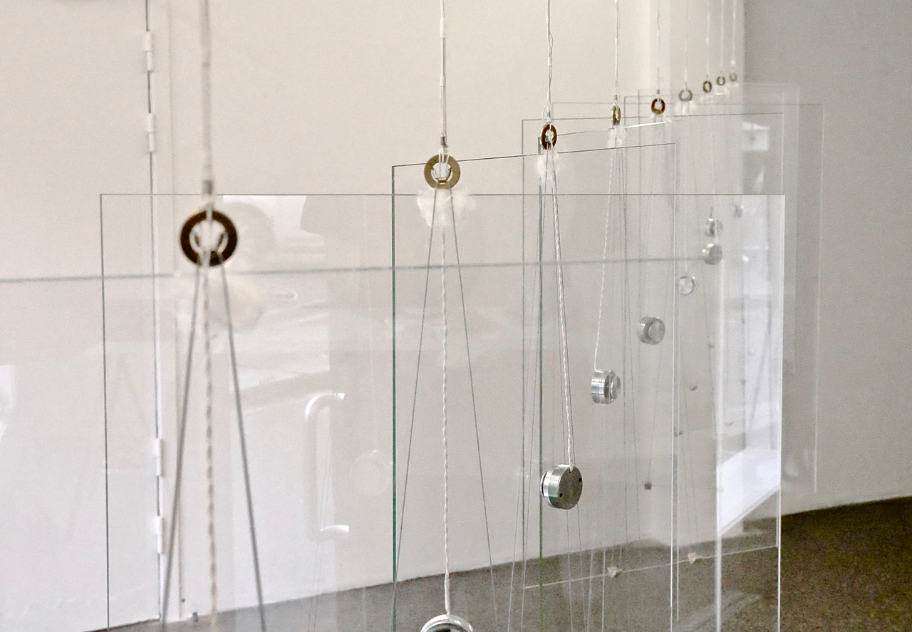 Skulpturell lydinstallasjon bestående av 17 glassplater preparert med tørre fargepigmenter og gips,