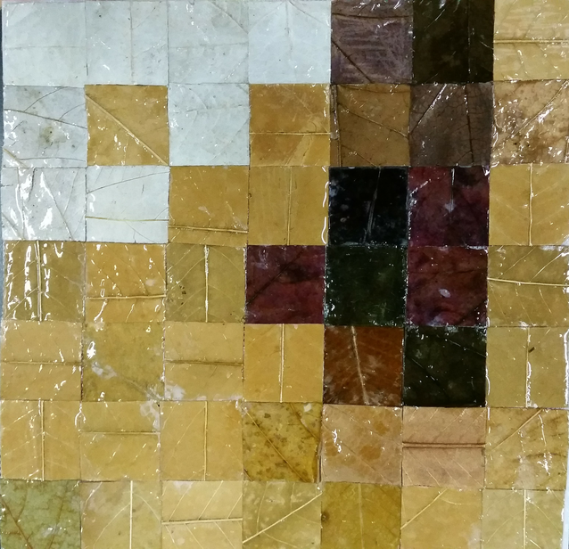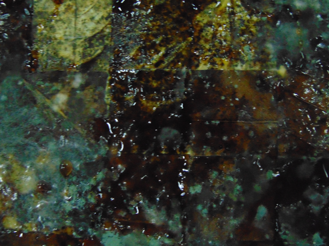 Al no trabajar en ambiente estéril y al utilizar materialidades húmedas, diversos hongos y microorganismos aparecen por generación espontánea sobre la matriz geométrica. Las hojas orgánicas funcionan como alimento y materia a degradar, a su vez que generan el surgimiento de otros microorganismos que en su interior poseían. Los límites cromáticos y físicos van desapareciendo y los conjuntos polifónicos (Tsing 2021) se hacen observables.