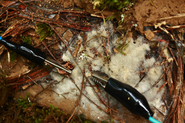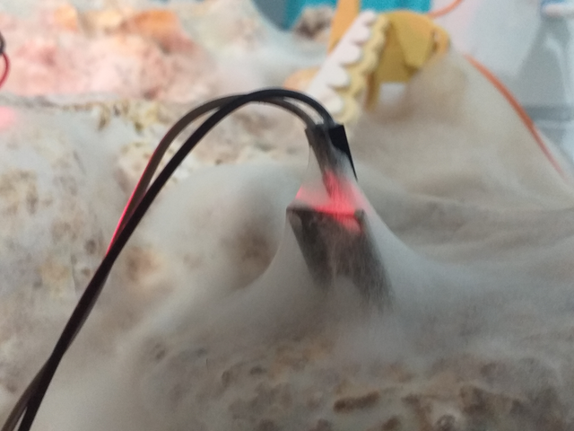 Durante el desarrollo, el hongo se expande más allá de todo condicionamiento humano: toma como alimento a metabolizar las figuras de animales de madera y los dispositivos electrónicos de sensado que regulan el microambiente y facilitan las condiciones de humedad y temperatura del organismo.