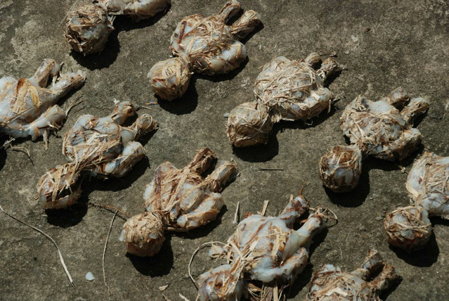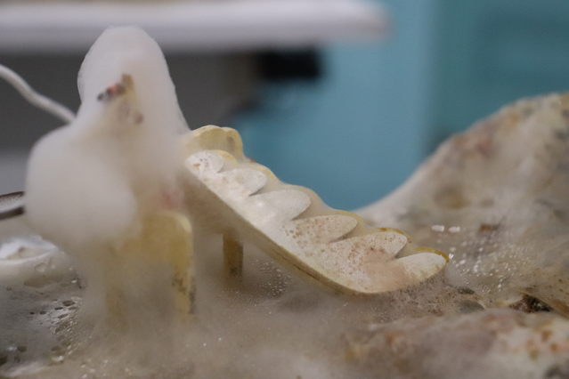 En un primer momento, se utilizaron moldes de yeso realizados a partir de positivos en arcilla para hacer relieves con micelio de hongo. Este fue mezclado con sustrato orgánico (alimento) para que los organismos fúngicos crecieran con la morfología del molde.