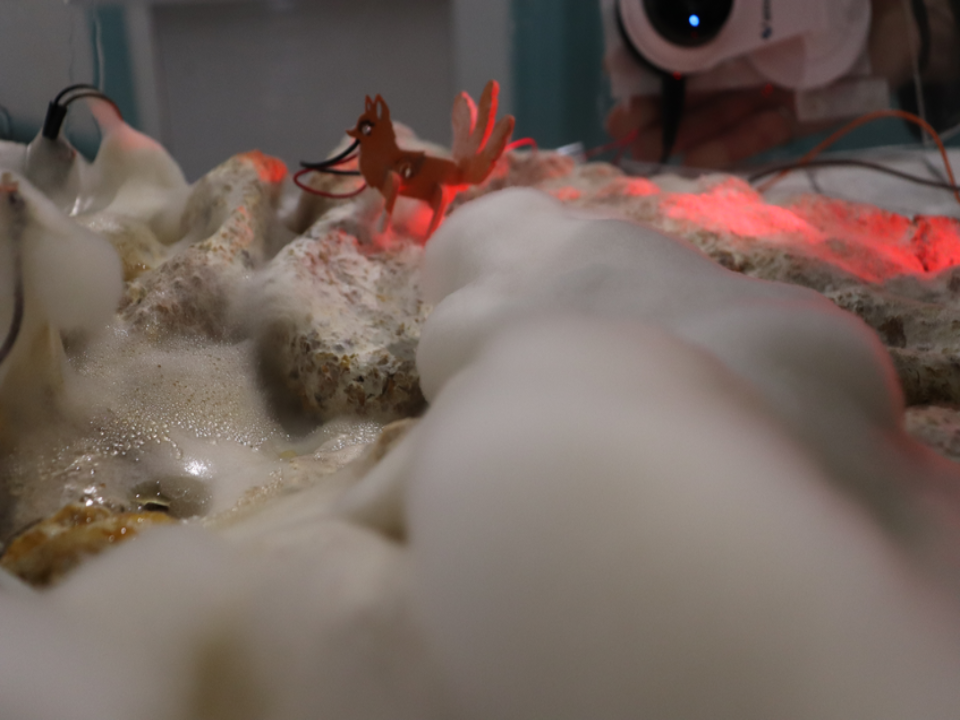 Instalación conformada por una plataforma en la que conviven cultivos de hongos junto con criaturas encastradas de animales y seres híbridos que se iluminan de acuerdo con índices de supervivencia. Está conformada por relieves topográficos realizados mediante micelio vivo de la especie Pleurotus ostratus y cultivados a partir de aserrín que funciona como alimento para posibilitar el crecimiento continuo. Los paisajes vivos están ubicados dentro de un contenedor de acrílico a modo de incubadora que dispone de un sistema de dispositivos electrónicos de control. Este sistema verifica la temperatura y la humedad tanto del microambiente como de los seres vivos. Además, evalúa la pertinencia de accionar el sistema humidificador reactor que compensa los cambios ambientales externos para que los ecosistemas internos se desarrollen con las condiciones óptimas.La obra se plantea desde un corrimiento conceptual del antropocentrismo, haciendo foco en los ecosistemas no-humanos y en sus adaptaciones a las acciones de la especie humana. Se trabaja dentro del paradigma de la Tercera Naturaleza propuesto por Anna Tsing (2021), en la que la misma se vuelve resiliente a los parámetros del capitalismo salvaje. De esta manera, mediante organismos vivos adaptados en el mundo real, se genera una representación artística variable temporalmente acorde a las condiciones del espacio expositivo. Ver más