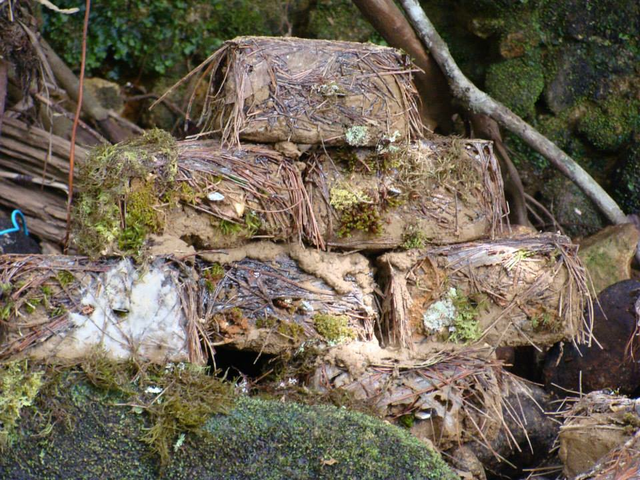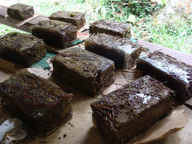 Confinamiento de la materia orgánica (residuos vegetales de cocina y hojarasca de pino) en forma de bloque/ladrillo, mediante barro y biocompuestos como medio de aglutinación. Como artista, me constituyo como activa y la materia se constituye como pasiva.