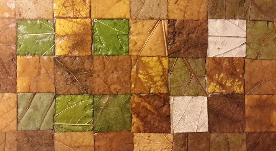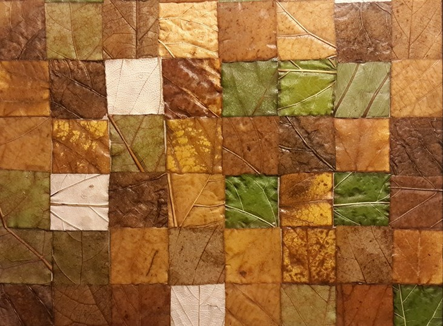 Como primer paso de Evolución de una partida, se generó una matriz con hojas de árboles en diferentes estadios de oxidación y se colocó un bioplástico de gelatina en su superficie. La materia orgánica fue insertada en un dispositivo con morfología geometrizada.