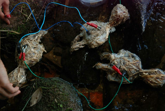 Los objetos fueron convertidos en celdas de combustible microbiano aprovechando los microorganismos presentes en el agua del río donde fueron emplazados. La adaptación, en este caso, puede medirse mediante un voltímetro para conocer la actividad energética que van generando las bacterias.