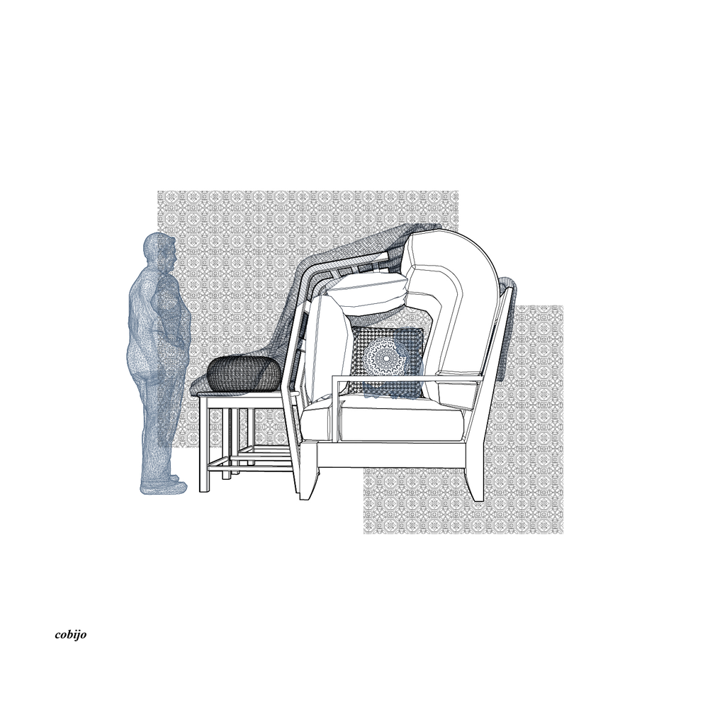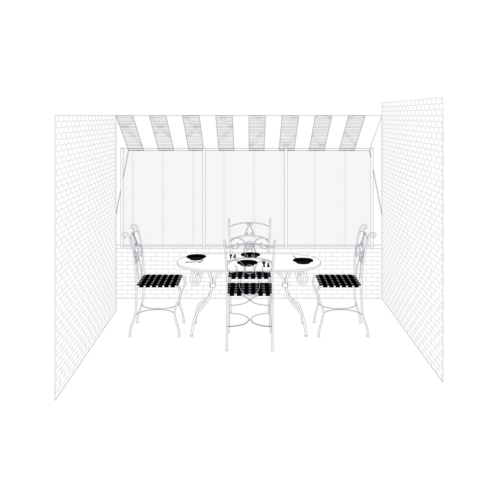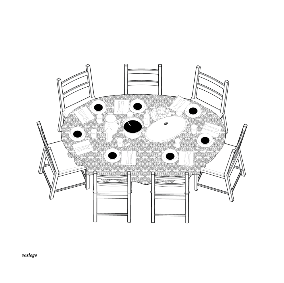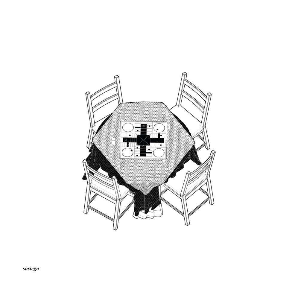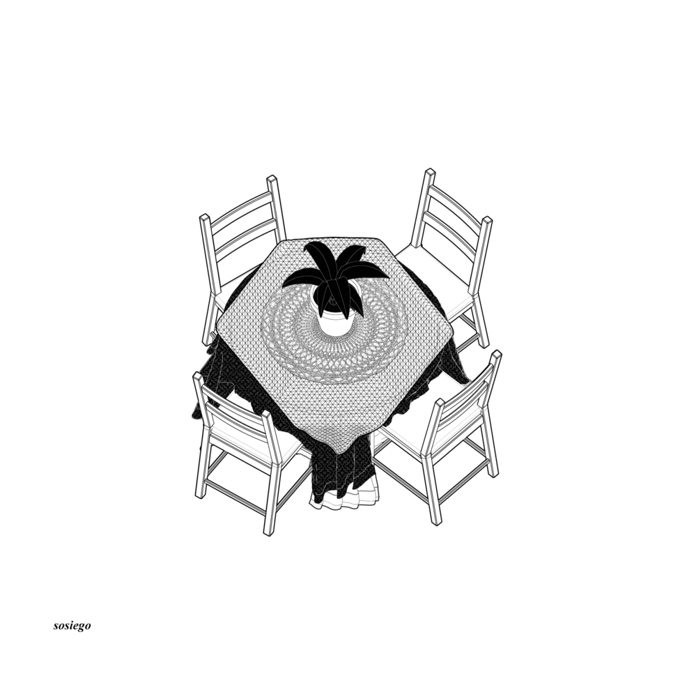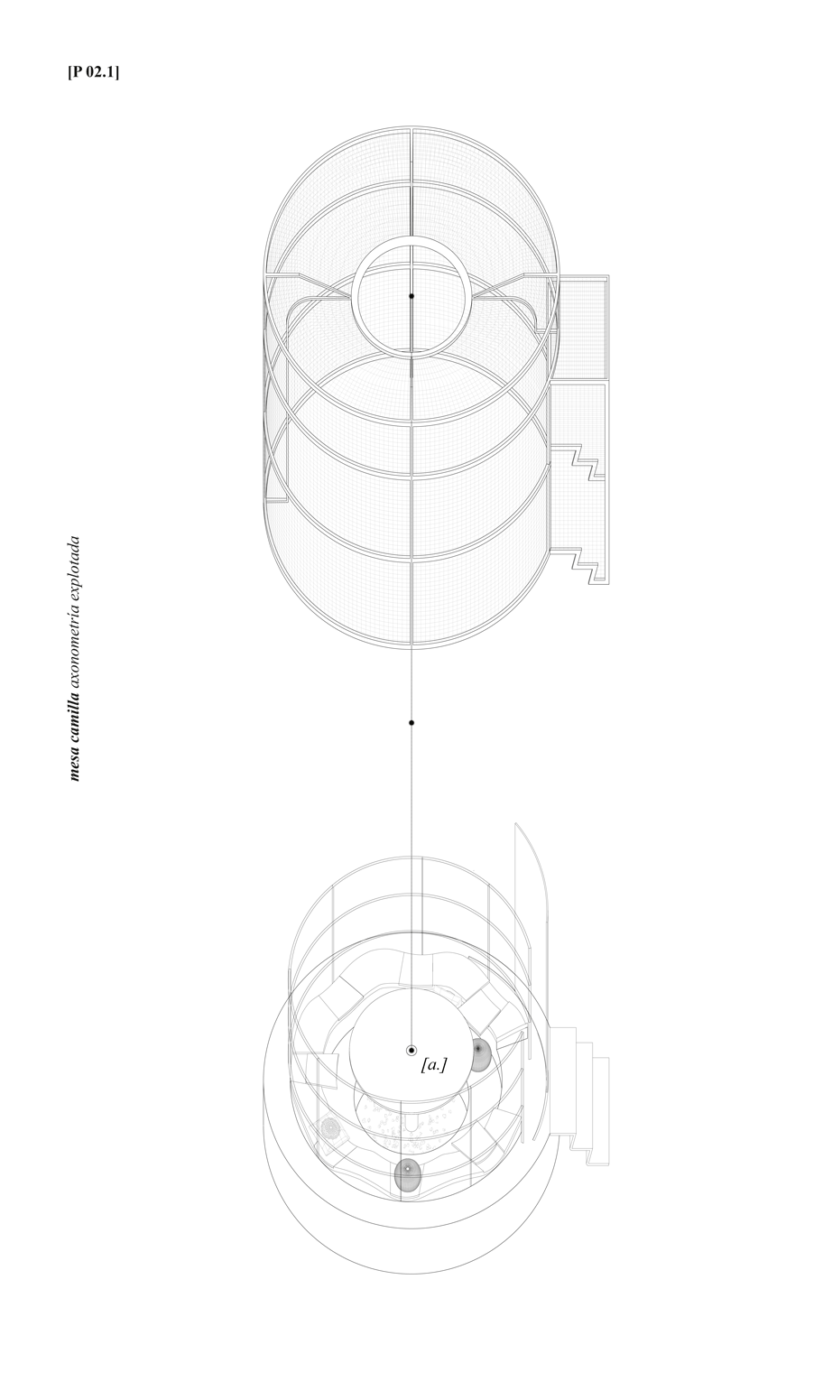 [z.] /mesa camilla/ mesa [y.] /cobijo/ parasol: protege el espacio interior de la interperie [x.] /tiempo/ recorrido solar: las dimensiones y porporción del espacio interior están calculadas /modelo paramétrico/ para acoger el recorrido solar, principalmente en los días cercanos a los equinocios/