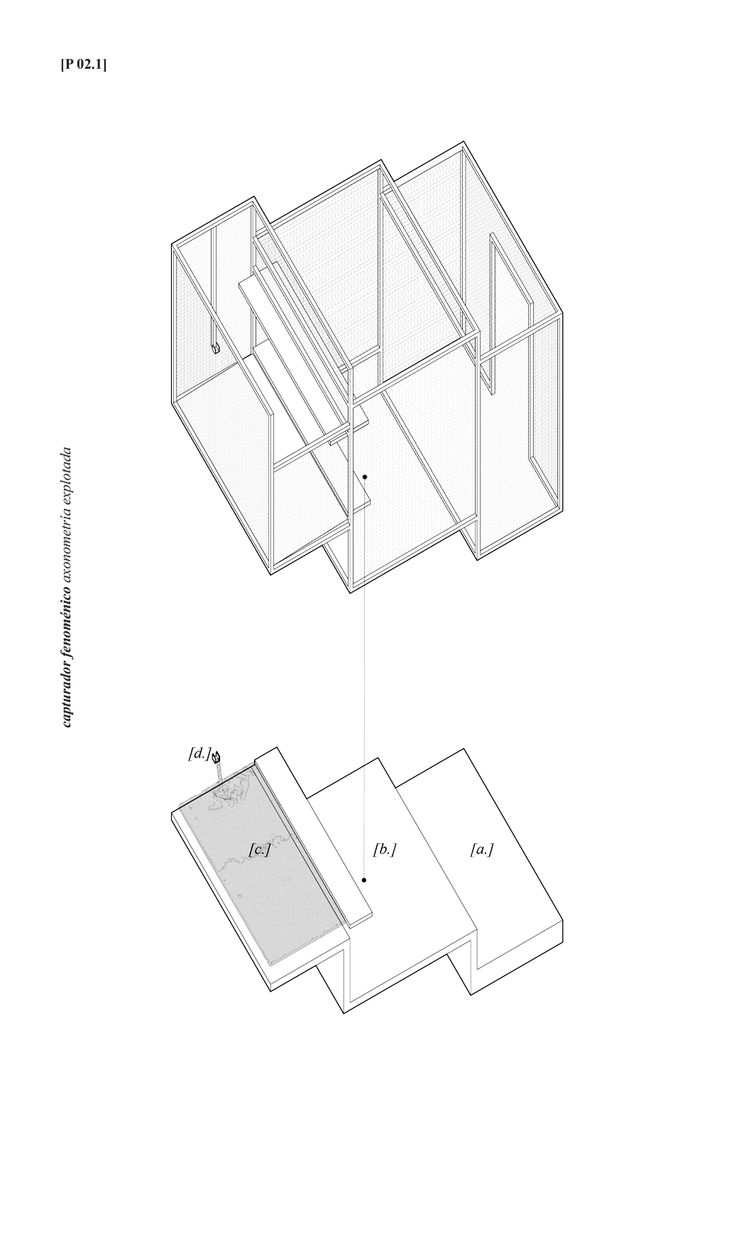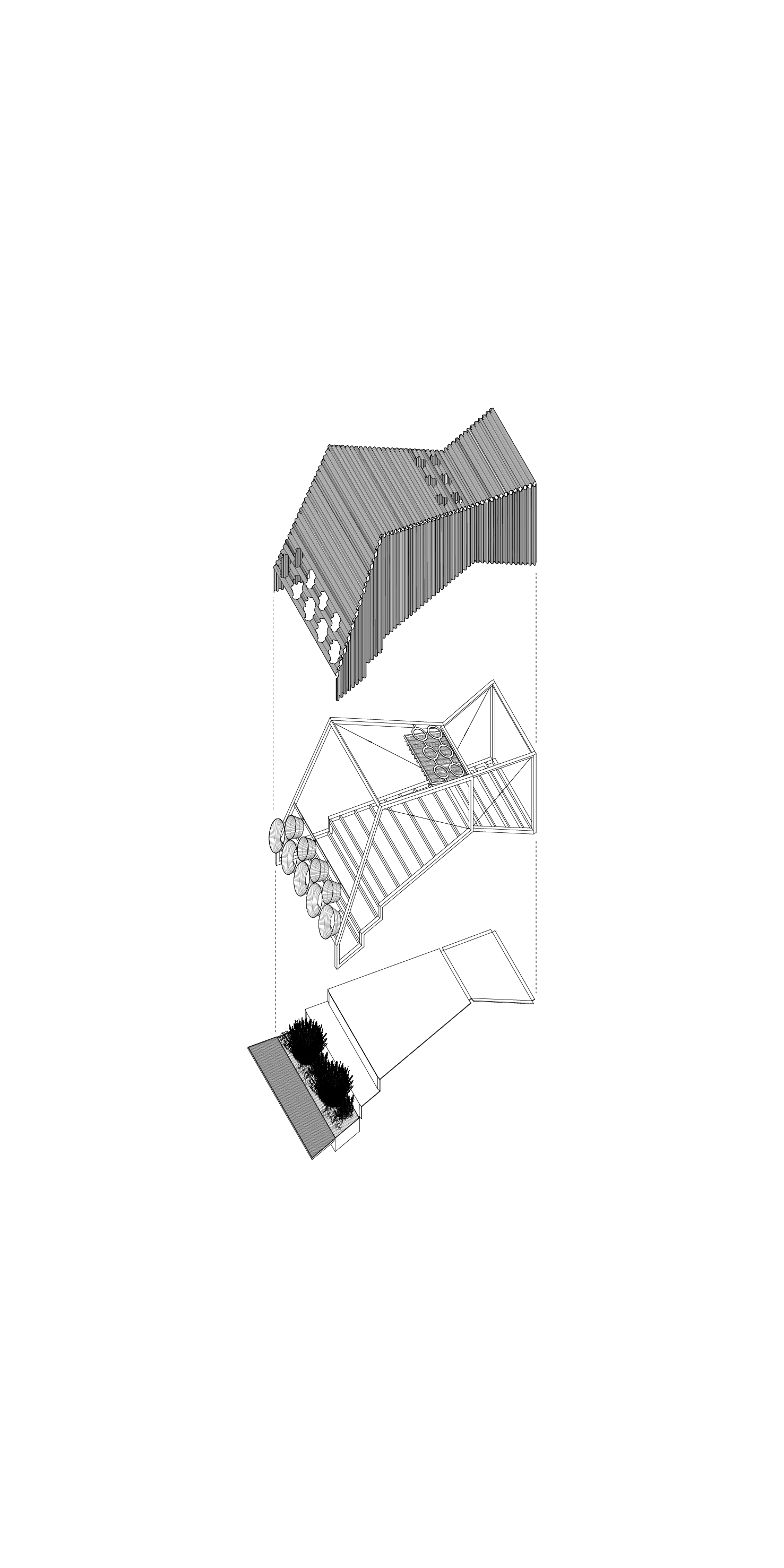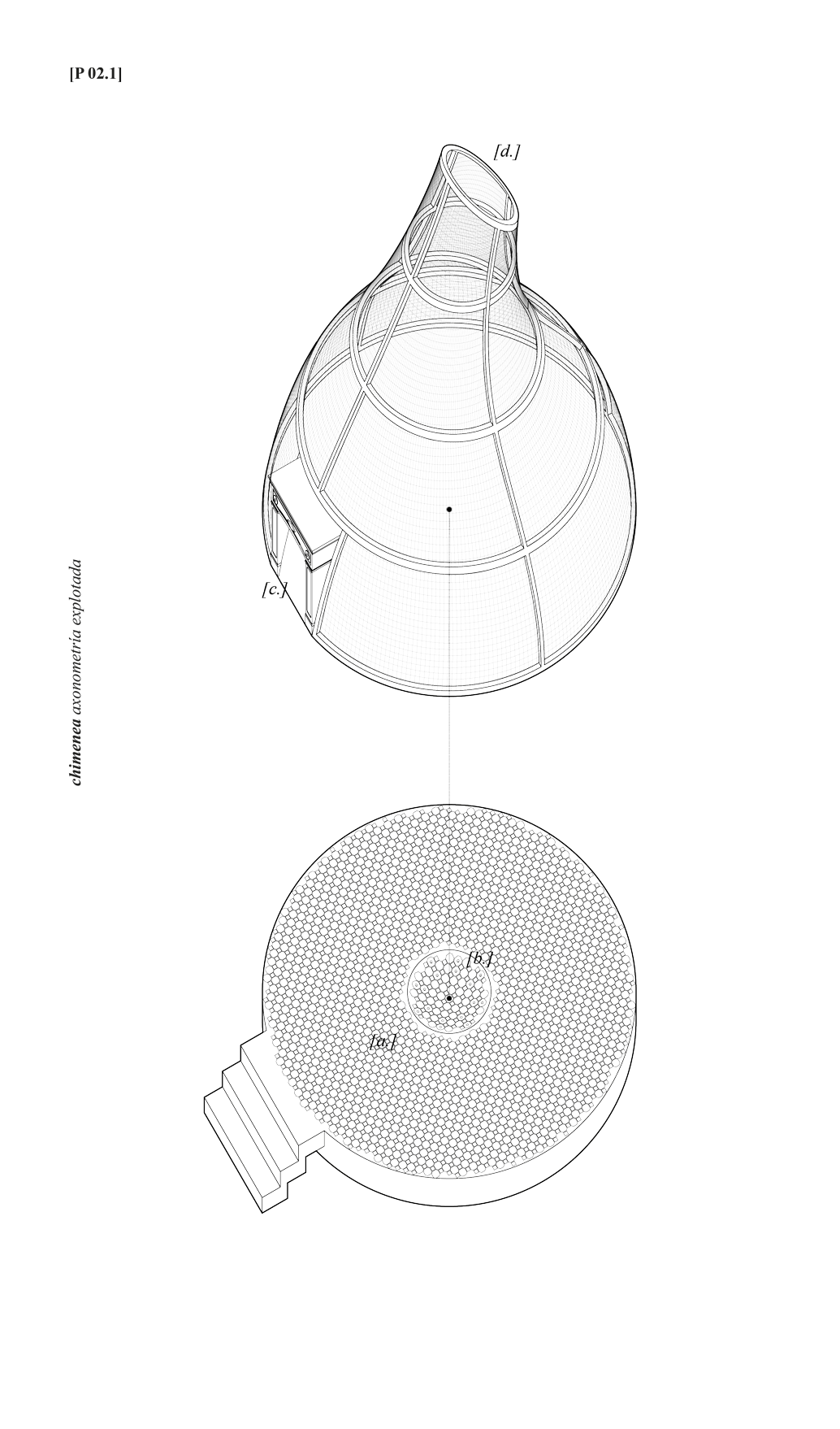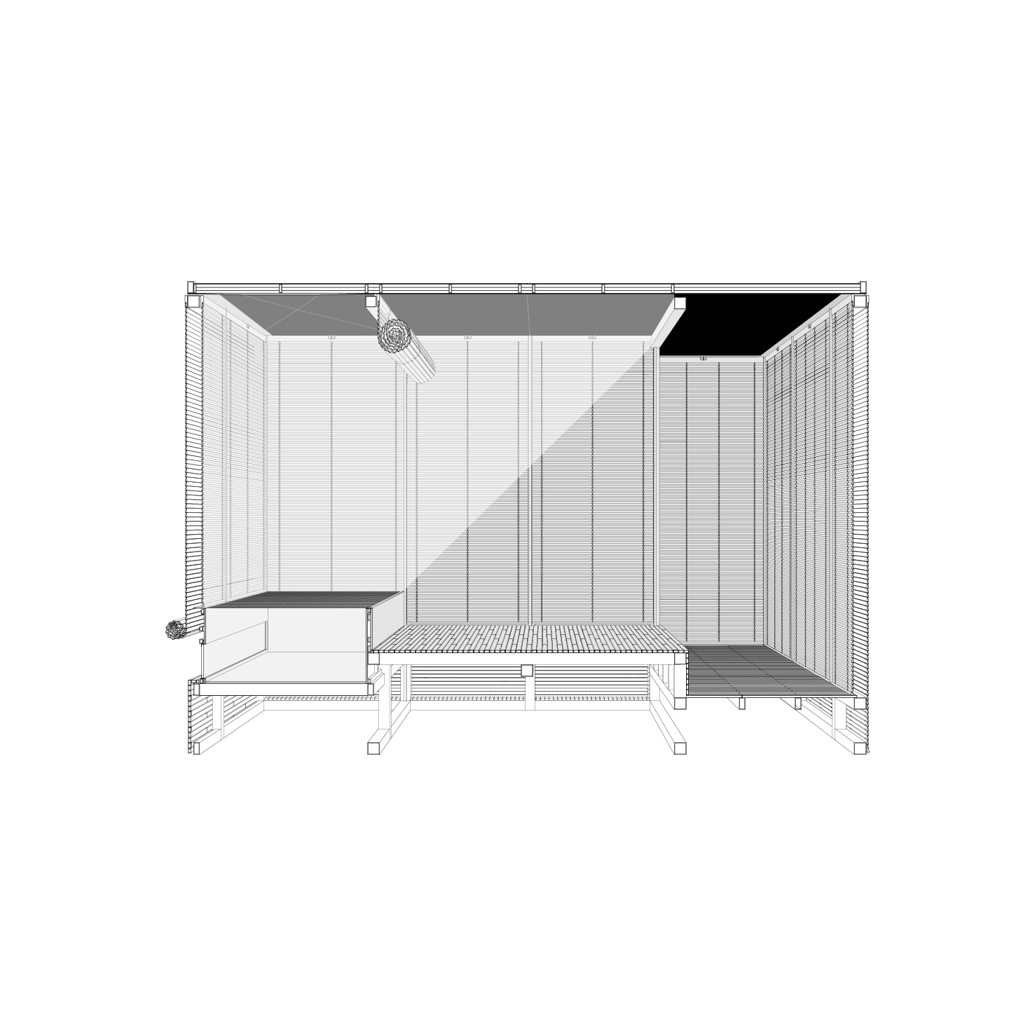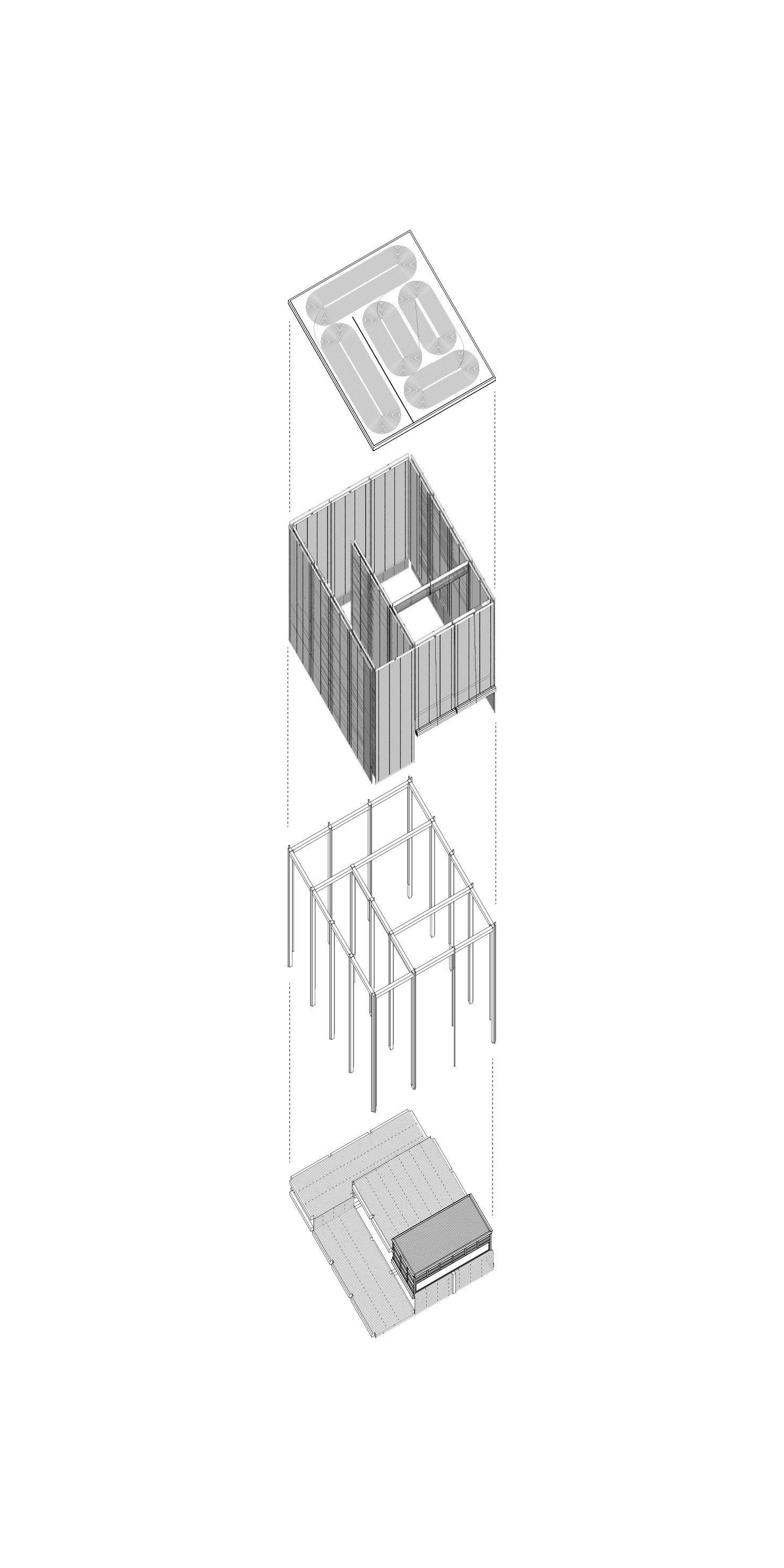 [a.] envolvente - sistema de fachada. capa exterior: policarbonato celular transparente de 24mm, cámara de aire de 100mm, capa interior: bastidor formado por entramado de listones de madera de 30x20mm cubierto en cambas caras por una lámina de tela arpillera de yute de color blanco roto [435gr/m exterior, 280gr/m interior] [b.] estructura: montantes formados por una sección de 4xlistones de madera de 40x40mm de 1m de longitud y unidos entre sí por un pletina de acero de 5mm [c.] cerramiento superior: carpintería de aluminio y placa de policarbonato compacto transparente [d.] pavimento: listones de madera de 40x20mm sobre rastreles de madera de 80x40mm [e.] vigas formadas por 3xlistones de 60x40mm superpuestas unidas entre sí por 2xlistones de 120x30mm de canto y placas de anclaje en sus extremos y en el centro apoyadas sobre murete de hormigón con huecos redondos de Ø180mm [f.] chimenea reconstruida con hormigón [molde de madera corte CNC]