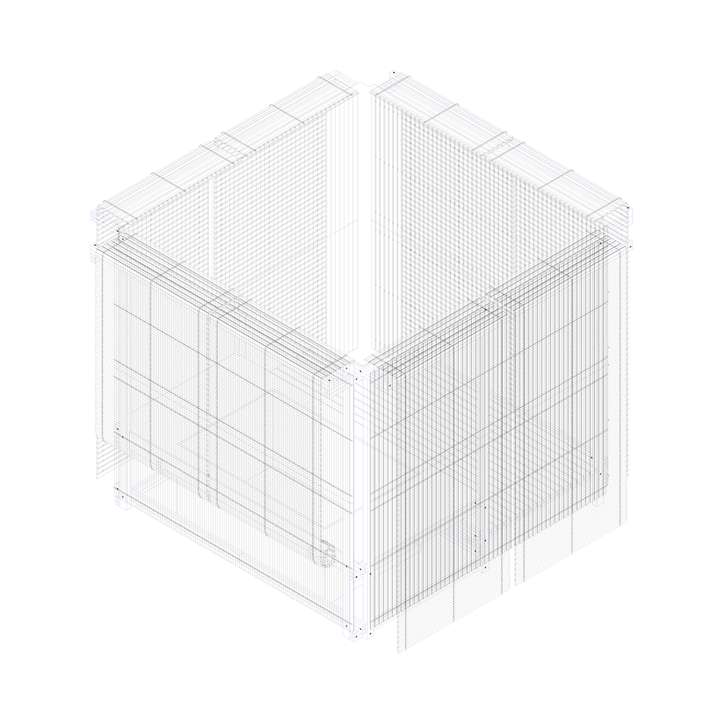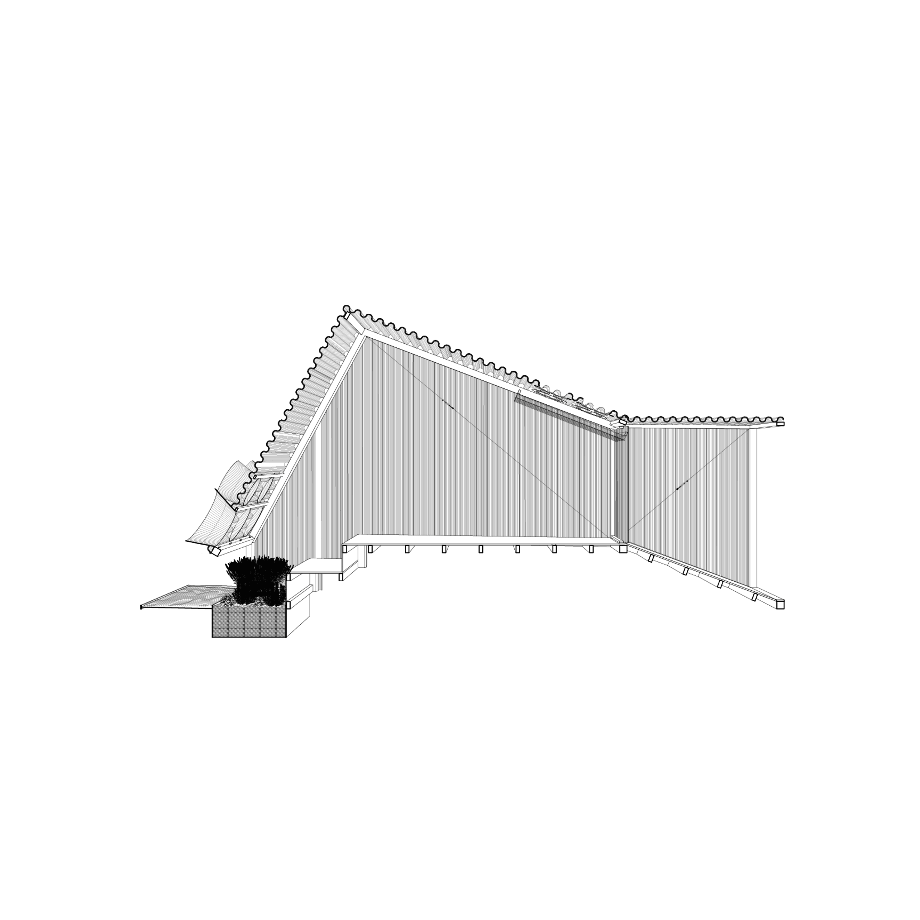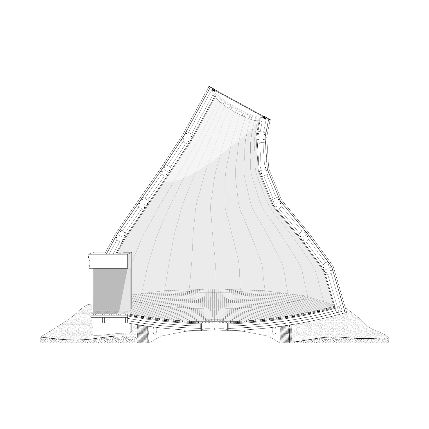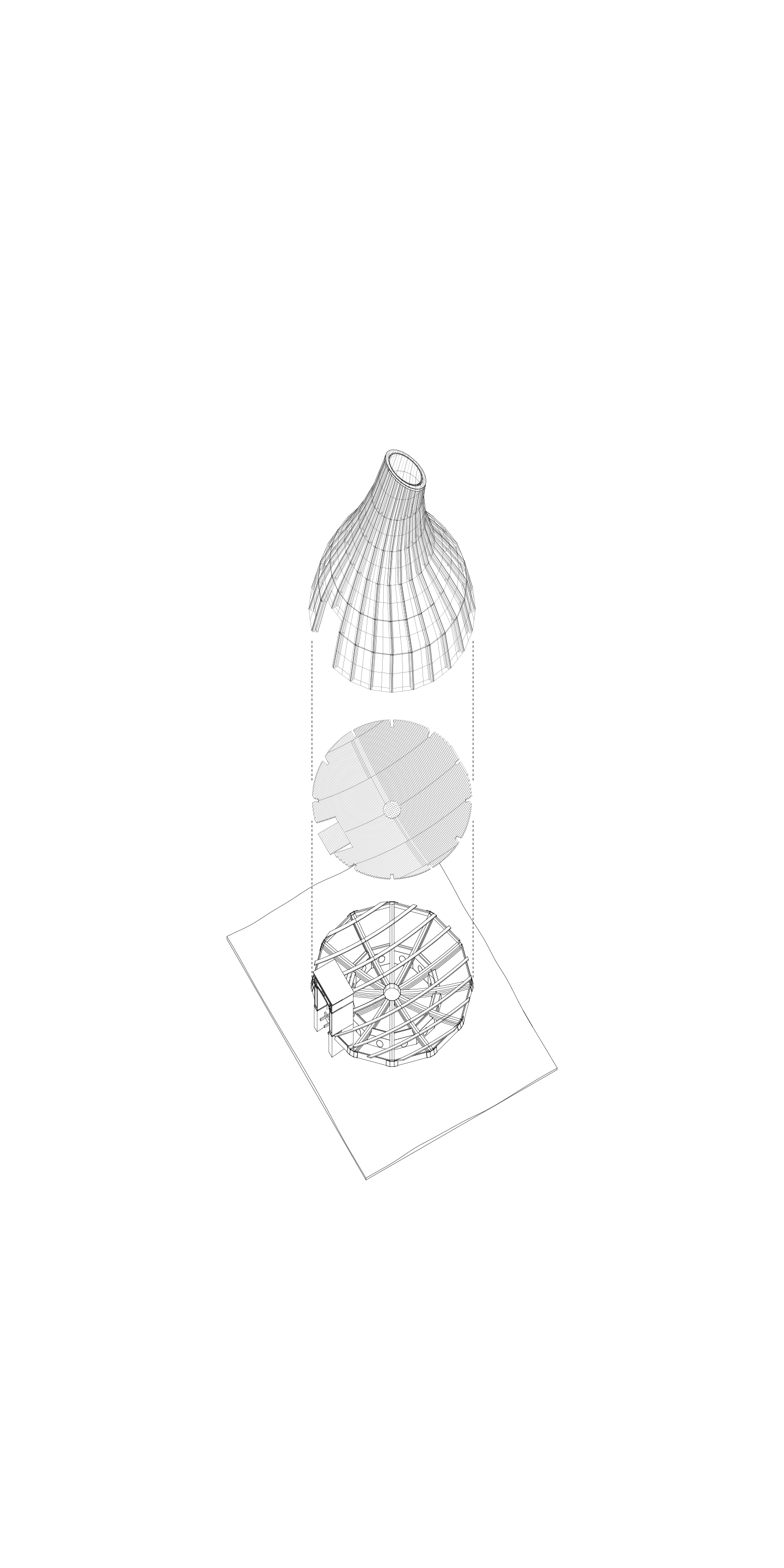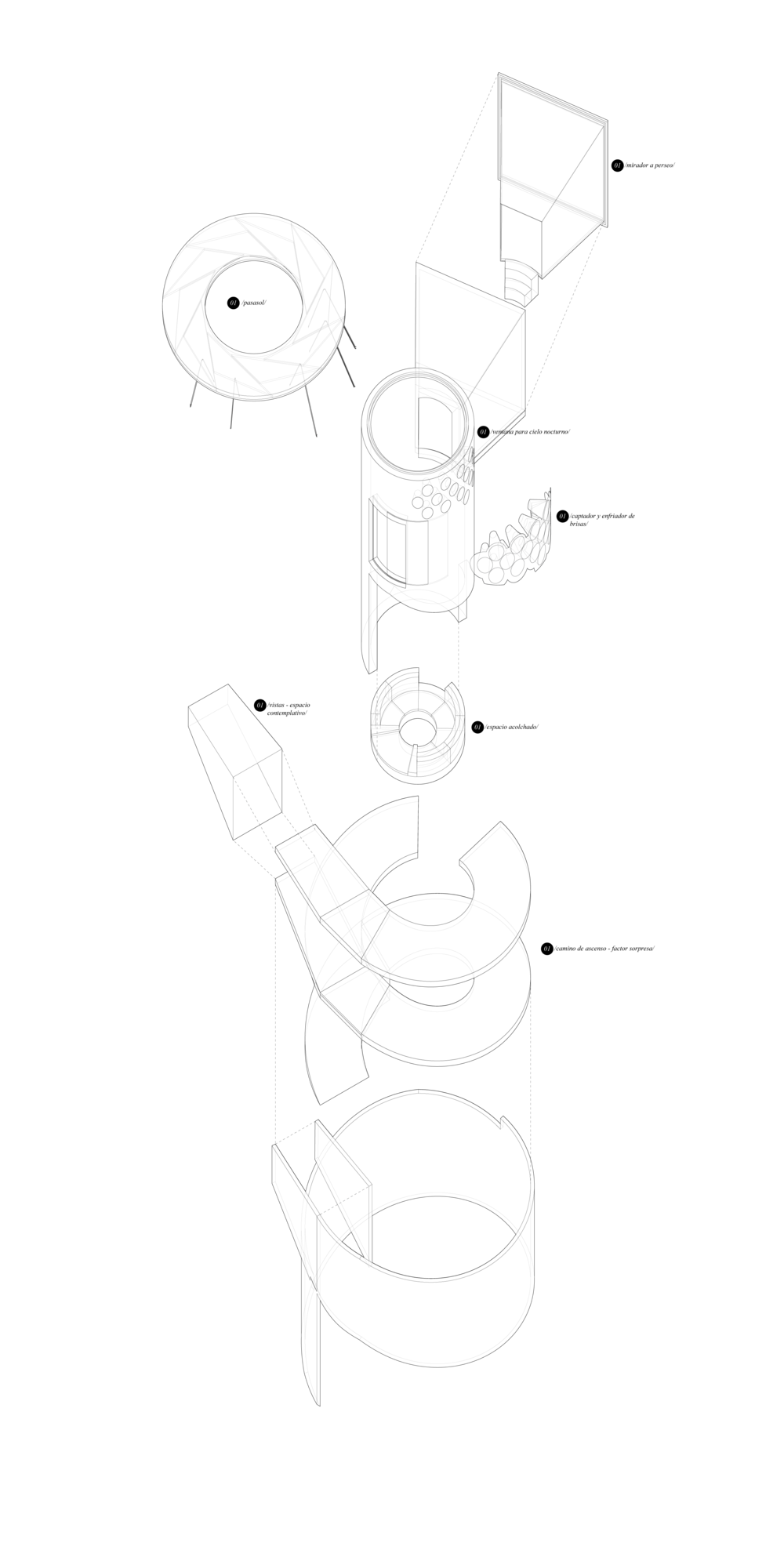 [a.] envolvente - sistema de fachada. capa exterior: policarbonato celular transparente de 24mm, cámara de aire de 100mm, capa interior: bastidor formado por entramado de listones de madera de 30x20mm cubierto en cambas caras por una lámina de tela arpillera de yute de color blanco roto [435gr/m exterior, 280gr/m interior] [b.] estructura: montantes formados por una sección de 4xlistones de madera de 40x40mm de 1m de longitud y unidos entre sí por un pletina de acero de 5mm [c.] cerramiento superior: carpintería de aluminio y placa de policarbonato compacto transparente [d.] pavimento: listones de madera de 40x20mm sobre rastreles de madera de 80x40mm [e.] vigas formadas por 3xlistones de 60x40mm superpuestas unidas entre sí por 2xlistones de 120x30mm de canto y placas de anclaje en sus extremos y en el centro apoyadas sobre murete de hormigón con huecos redondos de Ø180mm [f.] chimenea reconstruida con hormigón [molde de madera corte CNC]