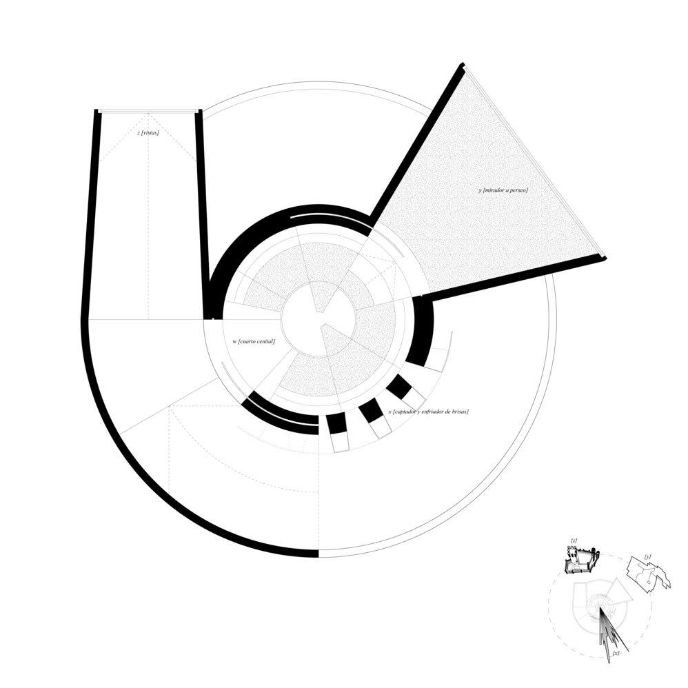 [z.] rayos solares: inciden sobre la lámina de agua y se reflejan sobre la superficie vegetal [y.] /aroma vernáculo/ aroma vaporizado de lavanda: se desprende como conseciencia del aumento de la temperatura superficial de las plantas [x.] brisa natural: recoge y transporta el aroma a lavanda [w.] puerta de acceso: actúa como válvula direccional para el flujo de aire