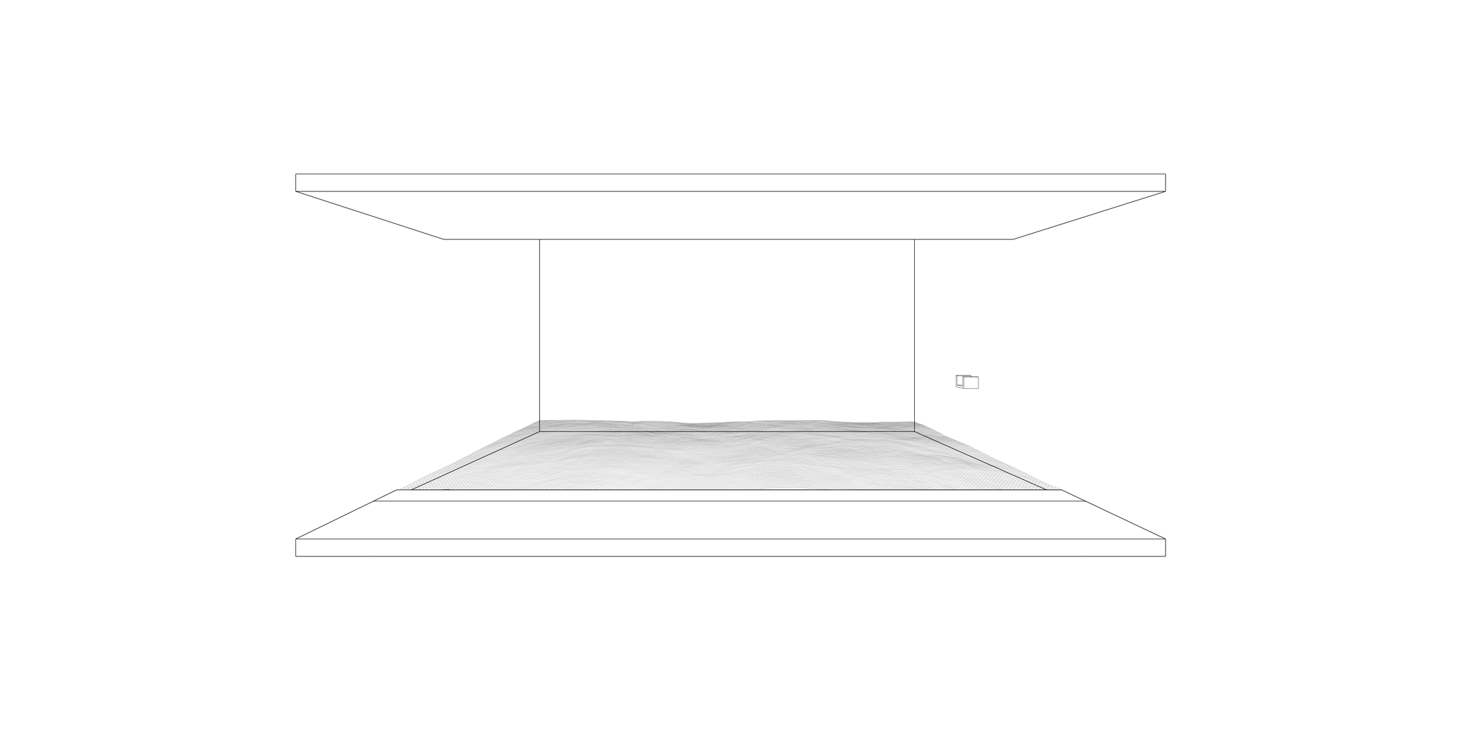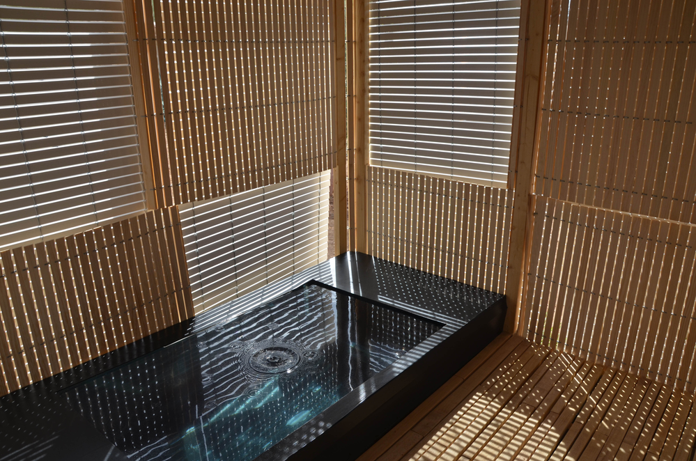 [z.] separación entre el cerramiento vertical y la cubierta de 10mm, lo que acentúa el espacio de penumbra generando un perímetro superior de contraluz que acompaña en el recorrido [y.] otro de los aspectos clave del diseño de este modelo es que el recorrido se realiza en sentido ascendente, esto se debe a la pretensión de salvar la altura de la bañera de modo que esta no se viese en sus dimensiones reales [x.] el agua llega al borde de la bañera rebasando por su perimetro, canalizada en todos sus bordes menos en el borde frontal, de este modo el agua que cubre baña la superficie de chapa de acero negro, lo que produce la enmascaración del único lateral visto de la bañera