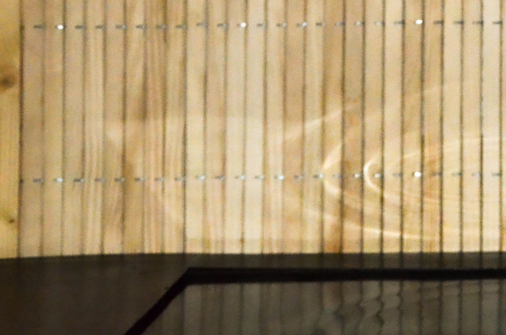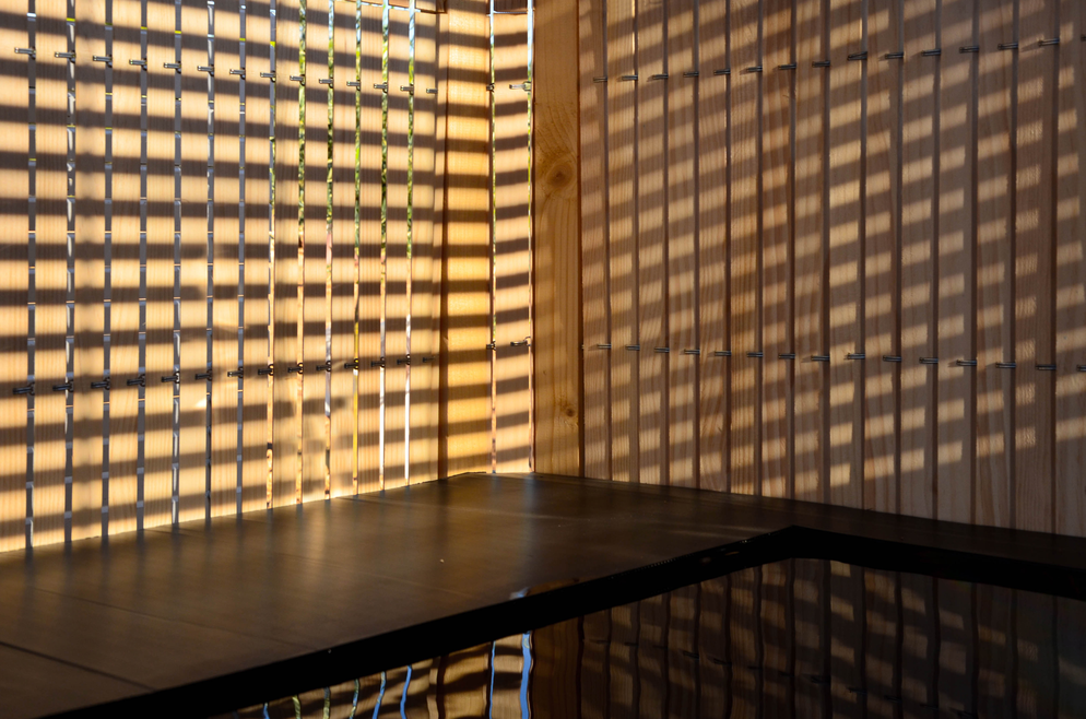 Asimismo, este recorrido está acompañado por el sonido continuo de una gota de agua que golpea la superficie de la bañera por el efecto de la condensación que se da en la cara inferior de la cubierta, lo que genera una onda que entra en juego con la refracción de la luz. Esta condensación, generada para tal efecto, se produce por el efecto de contraste de temperatura entre el agua de la bañera, calentada por un colector solar, y la chapa/