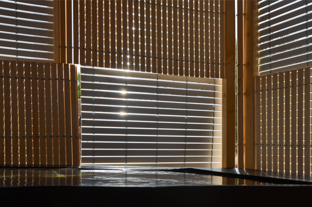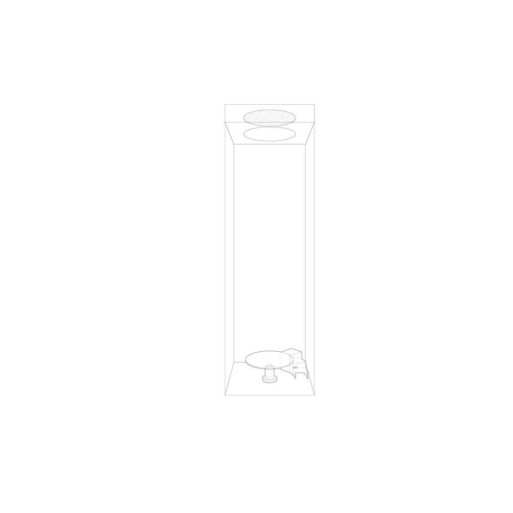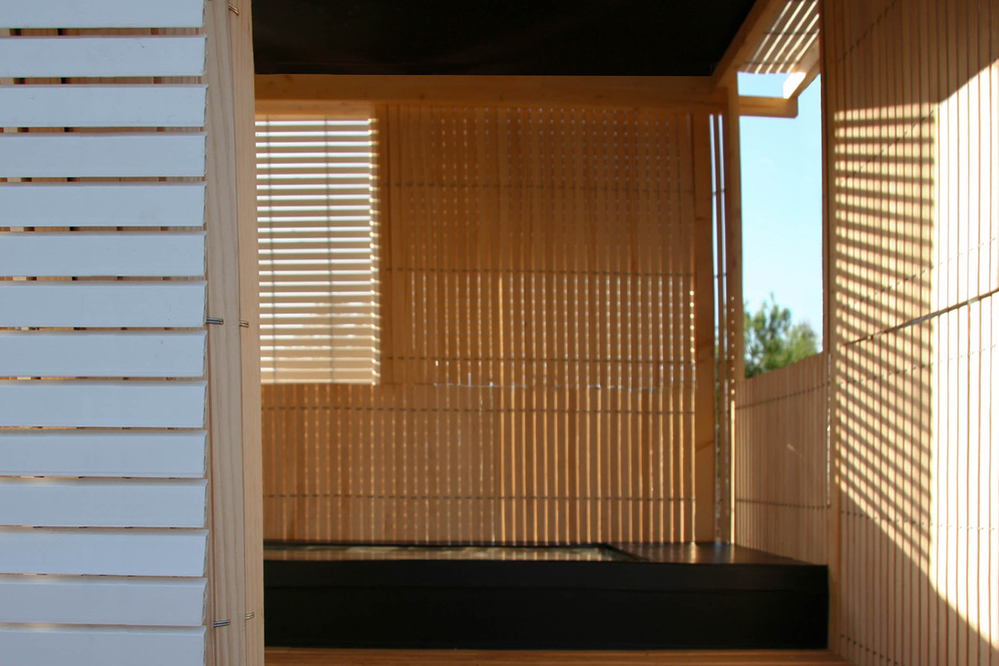 Funcionamiento_ Tanto por la noche como por la mañana temprano, debido a la humedad del ambiente, el rocío condensa una lámina de agua en la cubierta. De este modo, el agua queda almacenada en la parte superior de la misma para, a través de una pequeña perforación en el centro del vano sobre la bañera, gotear continuamente con un ritmo que varía dependiendo de la acumulación de agua. Asimismo, debido a la naturaleza experimental del proyecto, este modelo sirve así de laboratorio en el cual se puede experimentar con la luz y el color, así como con el movimiento de planos y de la propia lámina de agua con el objetivo de obtener diversos resultados que potencien o intensifiquen la experiencia del baño: se han realizado pruebas instalando un velo naranja entre las dos láminas de persianas con el propósito de equilibrar la luz azulada del ambiente antes del amanecer y después del atardecer; se ha tintado el agua de color azul y de color naranja por esta misma razón, equilibrio de color de la luz en el interior; y, por otro lado, se ha modificado la cantidad y el paso de agua para jugar así con el ritmo de goteo.