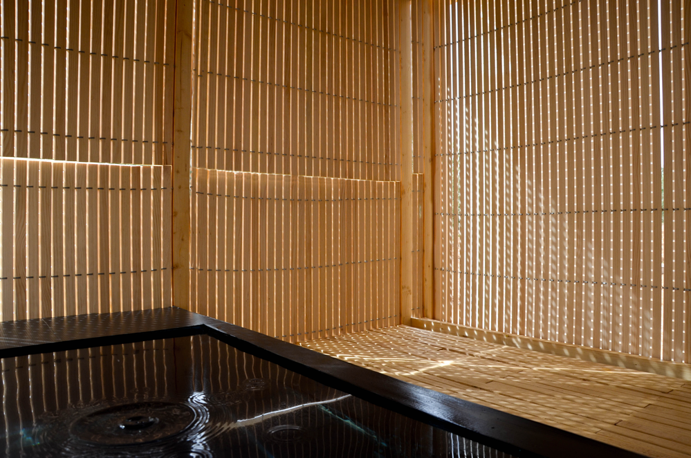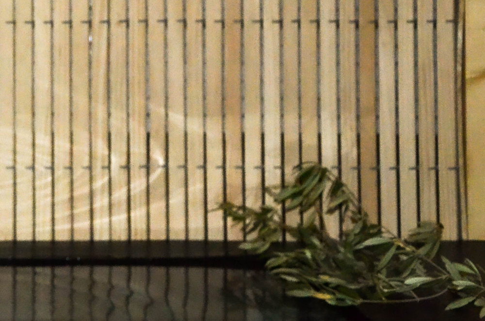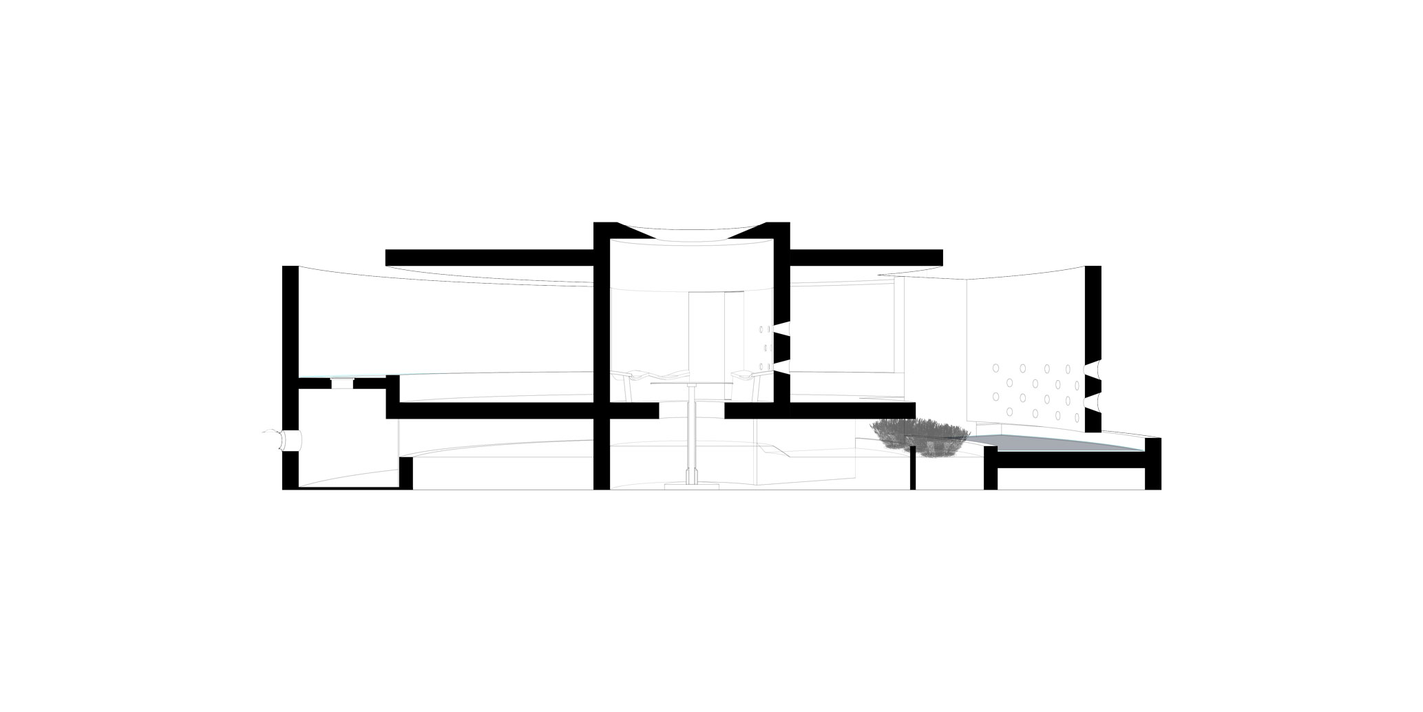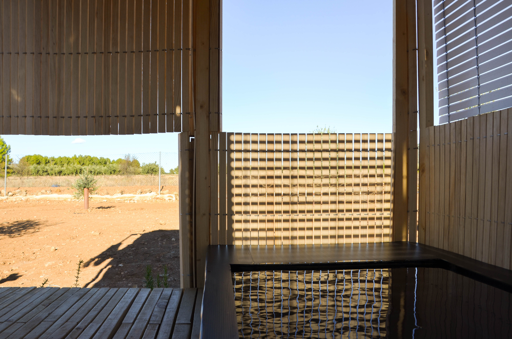 De esta forma, se transforma un elemento arquitectónico común —la bañera— en un captador de reflejos generados por la difracción de la luz que incide sobre un volumen de agua. Se produce un juego de luces y sombras que llevan al espectador a interactuar con el espacio en el que se encuentra. Luz y contraluz. Reflejos. Penumbra. Colores. Y hasta el arcoíris tiene lugar aquí. El baño se convierte así en una experiencia cognitiva y sensorial. La superposición de persianas de pie a la distorsión de los planos interiores. A todo ello se suma el suave sonido del mecer de las persianas y de los olivos circundantes; así como también, la brisa que atraviesa las lamas de la persiana transporta el aroma de las plantas vernáculas —lavanda y romero— que flanquean la construcción en sus caras este y oeste, principal dirección del viento en esta ubicación/