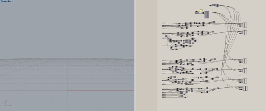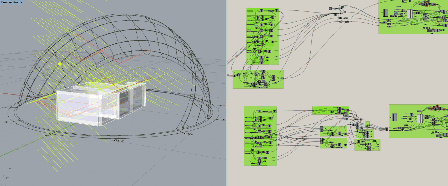 fase 2_ la fase de diseño se centra en dos modelos. El primero de ellos se basa en el diseño paramétrico con el fin de establecer las dimensiones apropiadas para el diseño de un espacio con una apertura cenital capaz de capturar el recorrido solar [ref_James Turrell]. Para ello se diseñan distintos modelos geométricos en la herramienta grasshopper para calcular, según la variación de sus dimensiones, cómo va a incidir la luz del sol en el interior del espacio. El segundo modelo propuesto se basa en la rutina de subir todos los veranos a la azotea para ver las perseidas: esta consiste en subir el tramo de escaleras en espiral que separan mi casa de la terraza; mirar, voluntaria o involuntariamente, al único elemento con iluminación que se puede observar desde dicha azotea: el castillo de la Atalaya; y, finalmente, colocarme en una posición de modo que tenga un campo de visión despejado en la dirección noreste, enfocado a la constelación de Perseo. Para el diseño de este modelo, se recoge en Grasshopper las coordenadas y la altitud exacta a la que se encuentra el castillo, así como el recorrido que hace la constelación de Perseo entre los días 11 y 13 de agosto. De este modo, se diseña un espacio que no solo recompone la rutina seguida durante estas noches de verano, sino que potencia ambas situaciones: enmarca y descontextualiza el castillo, mediante un ‘tunel’ oscuro que se funde con el color del cielo de noche y resalta el castillo, intensamente iluminado; mediante un espacio debidamente orientado que encuadra el recorrido que realiza la constelación, este protege a la vista del espectador de la contaminación lumínica de la propia ciudad.